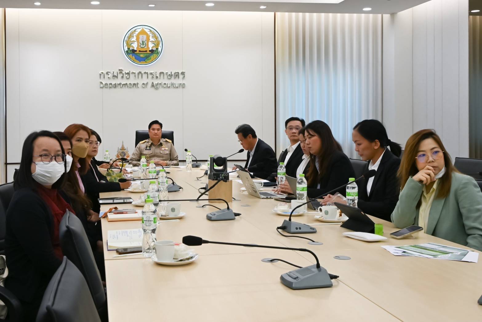 ในประเด็นความร่วมมือของกรมวิชาการเกษตร และบริษัทสยามคูโบต้าคอร์ปอเรชั่น จำกัด โดยบริษัทสยามคูโบต้าคอร์ปอเรชั่น จำกัด นำเสนอรายงานความก้าวหน้าของการผลิตถั่วเหลือง ที่บริษัท ร่วมมือกับ กรมวิชาการเกษตร โดยใช้องค์ความรู้ และชีวภัณฑ์ที่ผลิตโดยกรมวิชาการเกษตร ร่วมกับเทคโนโลยีของบริษัทฯ จนประสบความสำเร็จ ผลผลิตจากแปลงต้นแบบการปลูกถั่วเหลือง ที่ อ. ท่าเดื่อ จ.ชัยภูมิ ผลผลิตถั่วเหลืองในฤดูกาลผลิตในฤดูแล้งที่ผ่านมา ได้ผลผลิตเฉลี่ย 400 กก/ไร่ ซึ่งทางกรมวิชาการเกษตร และบริษัทฯ จะทำการพัฒนาการปลูกถั่วเหลืองร่วมกัน เพื่อนำเสนอ Dr. Malita Hajika Expert Advisor Farm Machinery เพื่อที่จะสร้างโมเดลที่มีประสิทธิภาพสูงสุด สำหรับการขยายผล Model การปลูกถั่วเหลืองที่เหมาะสมสำหรับประเทศไทย และหารือแนวทางการนำเข้าผลิตภัณฑ์ทางการเกษตร ของบริษัท เกษตรอินโน จำกัด ด้วย