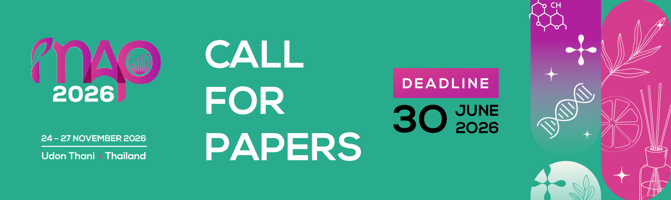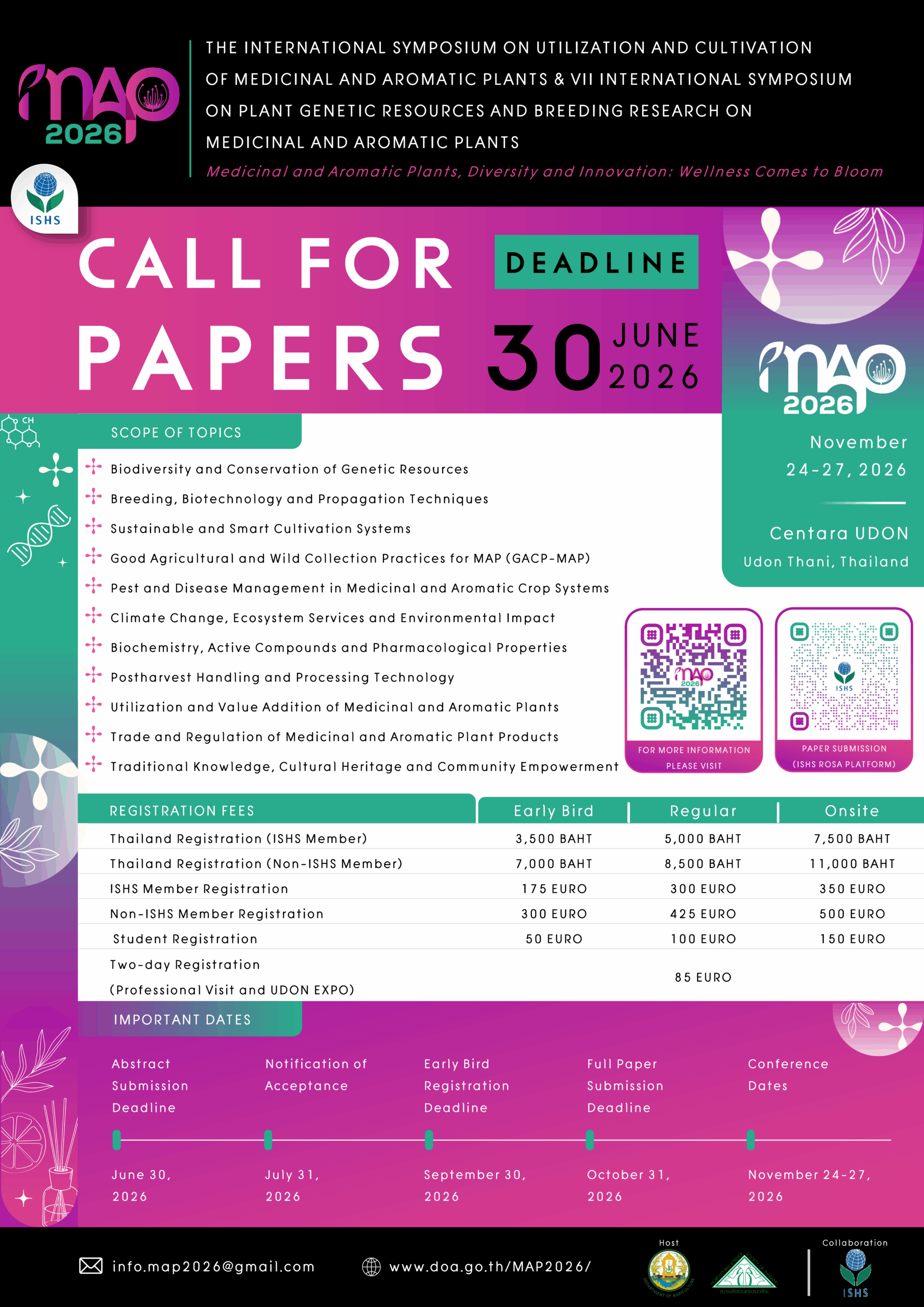 The International Symposium on Utilization and Cultivation of Medicinal and Aromatic Plants & VII International Symposium on Plant Genetic Resources and Breeding Research on Medicinal and Aromatic Plants (MAP2026) will be held from November 24 to 27, 2026, in Udon Thani, Thailand, in conjunction with the Udon Thani International Horticultural Expo 2026.