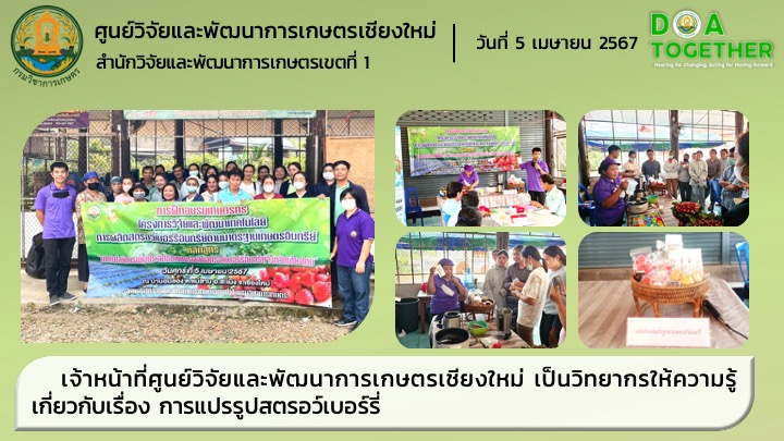 ข่าวประชาสัมพันธ์ เจ้าหน้าที่ศูนย์วิจัยและพัฒนาการเกษตรเชียงใหม่ เป็นวิทยากรให้ความรู้เกี่ยวกับเรื่อง การแปรรูปสตรอว์เบอร์รี่5 เมษายน 256722 ธันวาคม 2024