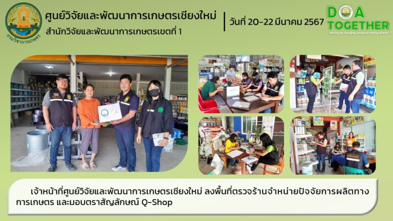 ข่าวประชาสัมพันธ์ เจ้าหน้าที่ศูนย์วิจัยและพัฒนาการเกษตรเชียงใหม่ ลงพื้นที่ตรวจร้านจำหน่ายปัจจัยการผลิตทางการเกษตร และมอบตราสัญลักษณ์ Q-Shop22 มีนาคม 256722 ธันวาคม 2024