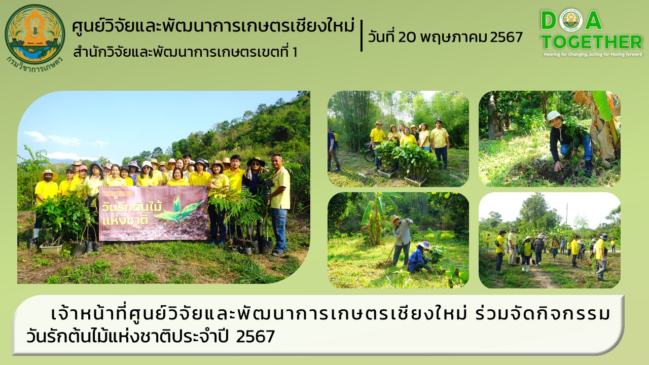 ข้าราชการ พนักงาน และ เจ้าหน้าที่ของศูนย์วิจัยและพัฒนาการเกษตรเชียงใหม่ ร่วมจัดกิจกรรมวันรักต้นไม้แห่งชาติประจำปี 2567 โดยร่วมกันปลูกต้นมะค่า ตะคร้ำ กาแฟ มะขามป้อม และต้นเหลืองอินเดีย ในพื้นที่บริเวณศูนย์วิจัยและพัฒนาการเกษตรเชียงใหม่ ณ ตำบลโป่งน้ำร้อน อำเภอฝาง จังหวัดเชียงใหม่