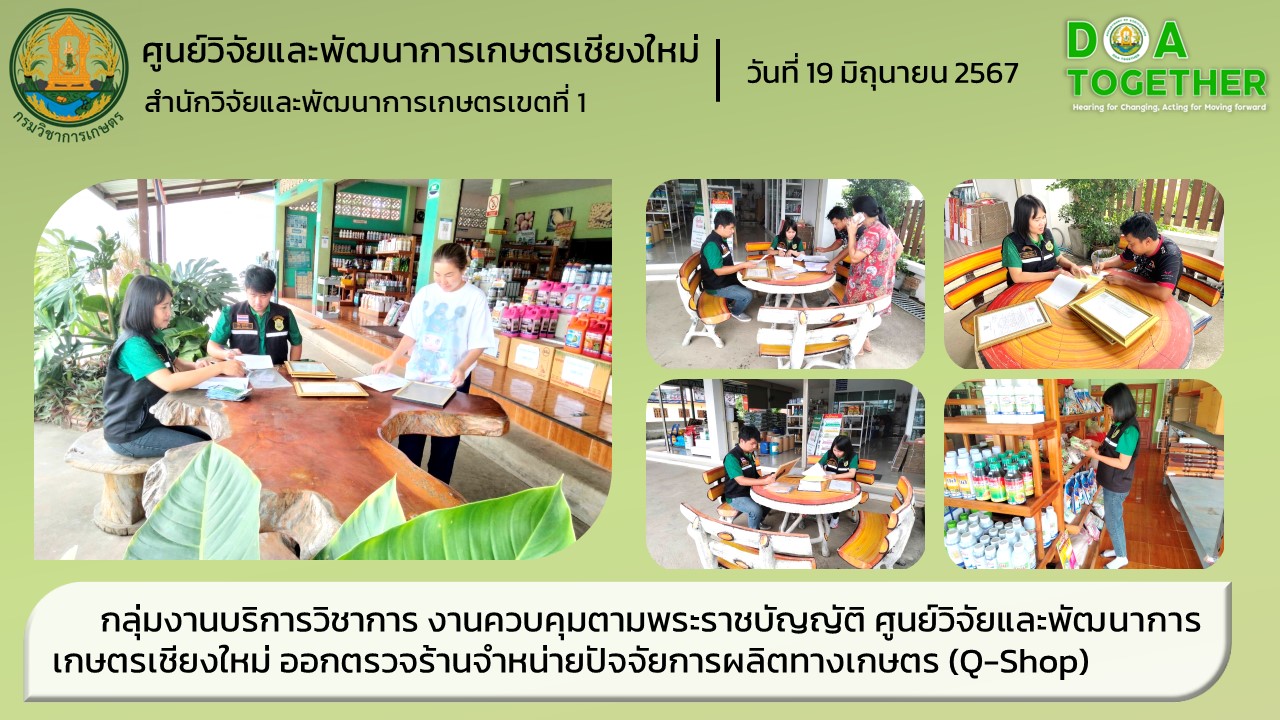 กลุ่มงานบริการวิชาการ งานควบคุมตามพระราชบัญญัติ ศูนย์วิจัยและพัฒนาการเกษตรเชียงใหม่ ได้แก่ นางสาวแววดาว สมตา เจ้าพนักงานการเกษตรชำนาญงาน และนายลิขิต บุตรตาพา นักวิชาการเกษตร ออกตรวจร้านจำหน่ายปัจจัยการผลิตทางเกษตร (Q-Shop) ในพื้นที่ อำเภอฝาง จังหวัดเชียงใหม่