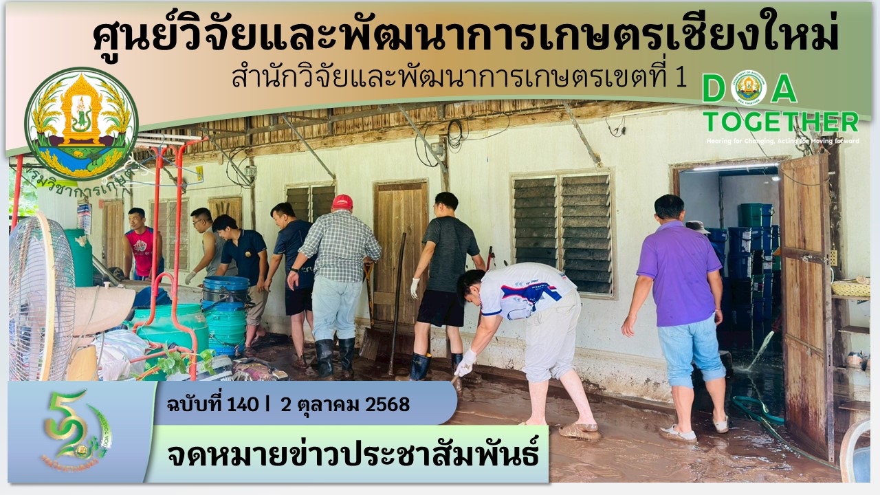 วันที่ 2 ตุลาคม 2568 เกิดฝนตกหนักต่อเนื่องในพื้นที่อำเภอฝาง จังหวัดเชียงใหม่ ส่งผลให้ศูนย์วิจัยและพัฒนาการเกษตรเชียงใหม่ประสบอุทกภัย น้ำป่าไหลหลากเข้าท่วมบ้านพักเจ้าหน้าที่ทั้งในและนอกพื้นที่ศูนย์ฯ นางสาวฉัตรสุดา เชิงอักษร ผู้อำนวยการศูนย์ฯ มอบหมายให้ นางนงคราญ นึกเร็ว เจ้าพนักงานธุรการอาวุโส พร้อมเจ้าหน้าที่ที่เกี่ยวข้อง ลงพื้นที่สำรวจความเสียหาย ให้การช่วยเหลือเร่งด่วน และดำเนินการฟื้นฟูทำความสะอาดบ้านพัก รวมทั้งพื้นที่ชุมชนโดยรอบ เพื่อบรรเทาความเดือดร้อนเบื้องต้นเรียบร้อยแล้ว