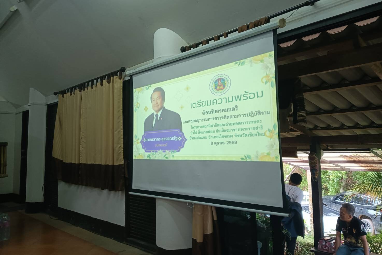 วันที่่ 8 ตุลาคม 2568 นายศราวุธ ถาวัน นักวิชาการเกษตร ร่วมประชุมเตรียมความพร้อมรับการตรวจเยี่ยม นายพลากร สุวรรณรัฐ องคมนตรี และคณะ ณ ห้องประชุมสำนักงานโครงการสถานีสาธิตและถ่ายทอดการเกษตร ป่าไม้ สิ่งแวดล้อม อันเนื่องมาจากพระราชดำริ บ้านแปกแซม ตำบลเปียงหลวง อำเภอเวียงแหง จังหวัดเชียงใหม่