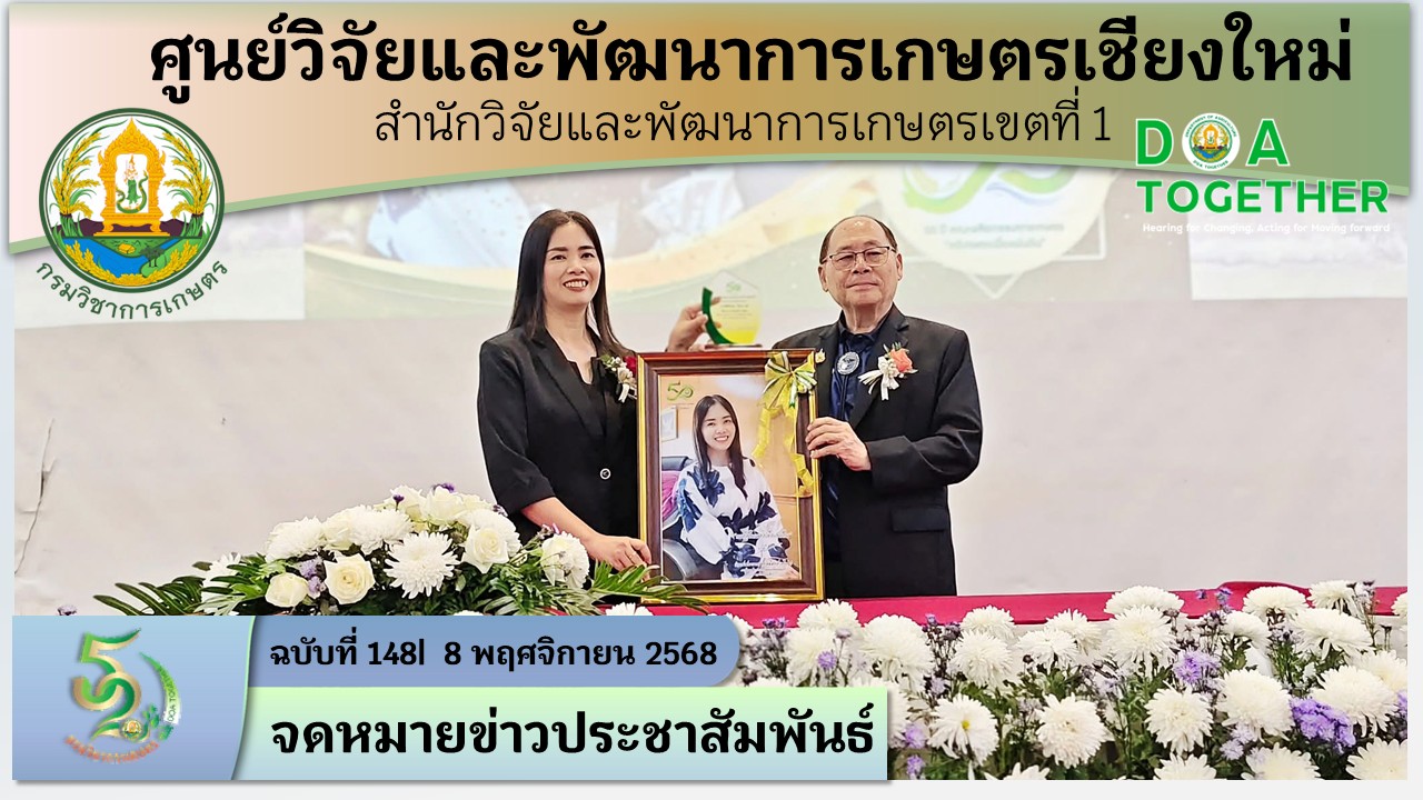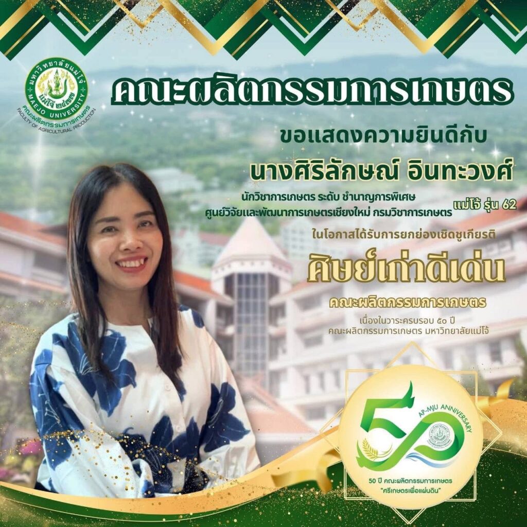 ศูนย์วิจัยและพัฒนาการเกษตรเชียงใหม่ ขอแสดงความยินดี กับ นางศิริลักษณ์ อินทะวงศ์ ตำแหน่ง นักวิชาการเกษตรชำนาญการพิเศษ ในโอกาสได้รับ โล่เกียรติคุณศิษย์เก่าดีเด่น คณะผลิตกรรมการเกษตร เนื่องในวาระครบรอบ 50 ปี คณะผลิตกรรมการเกษตร มหาวิทยาลัยแม่โจ้ โดยมีศิษย์เก่าคณะผลิตกรรมการเกษตรที่ได้รับรางวัล จำนวน 62 ราย ณ ห้องข้าวหอมมะลิ อาคารเฉลิมพระเกียรติสมเด็จพระเทพรัตนราชสุดาฯ มหาวิทยาลัยแม่โจ้ จังหวัดเชียงใหม่