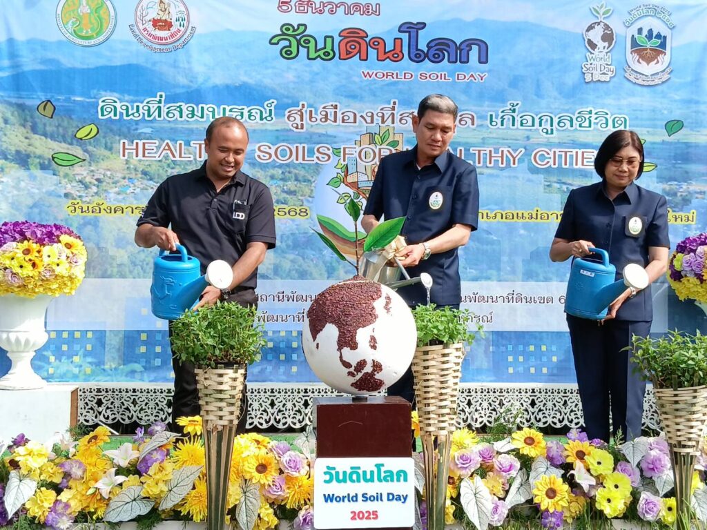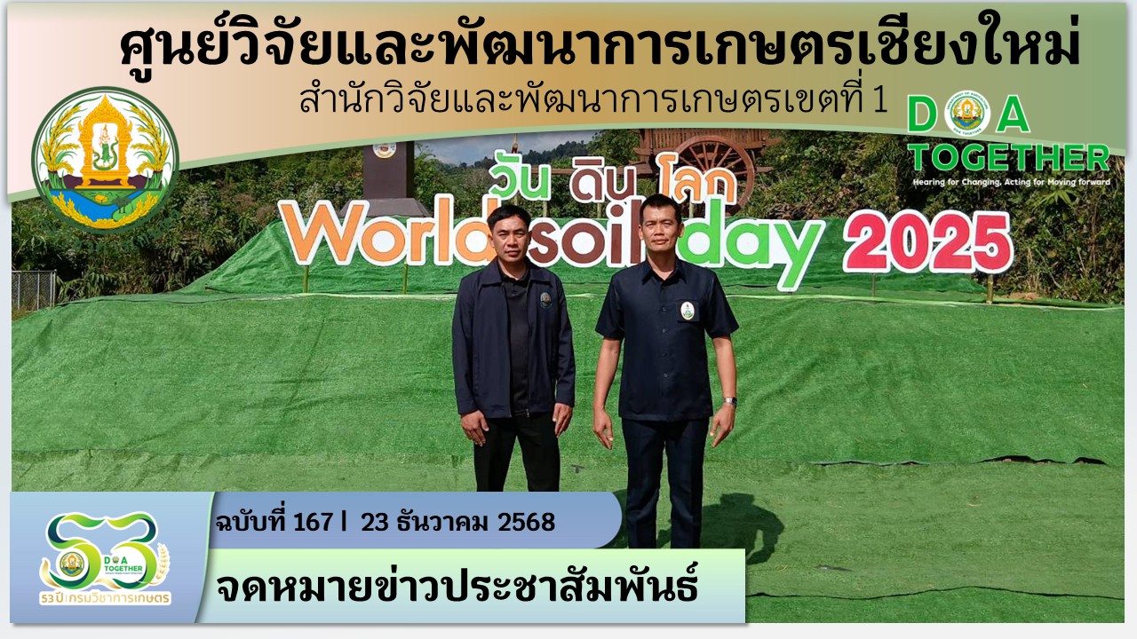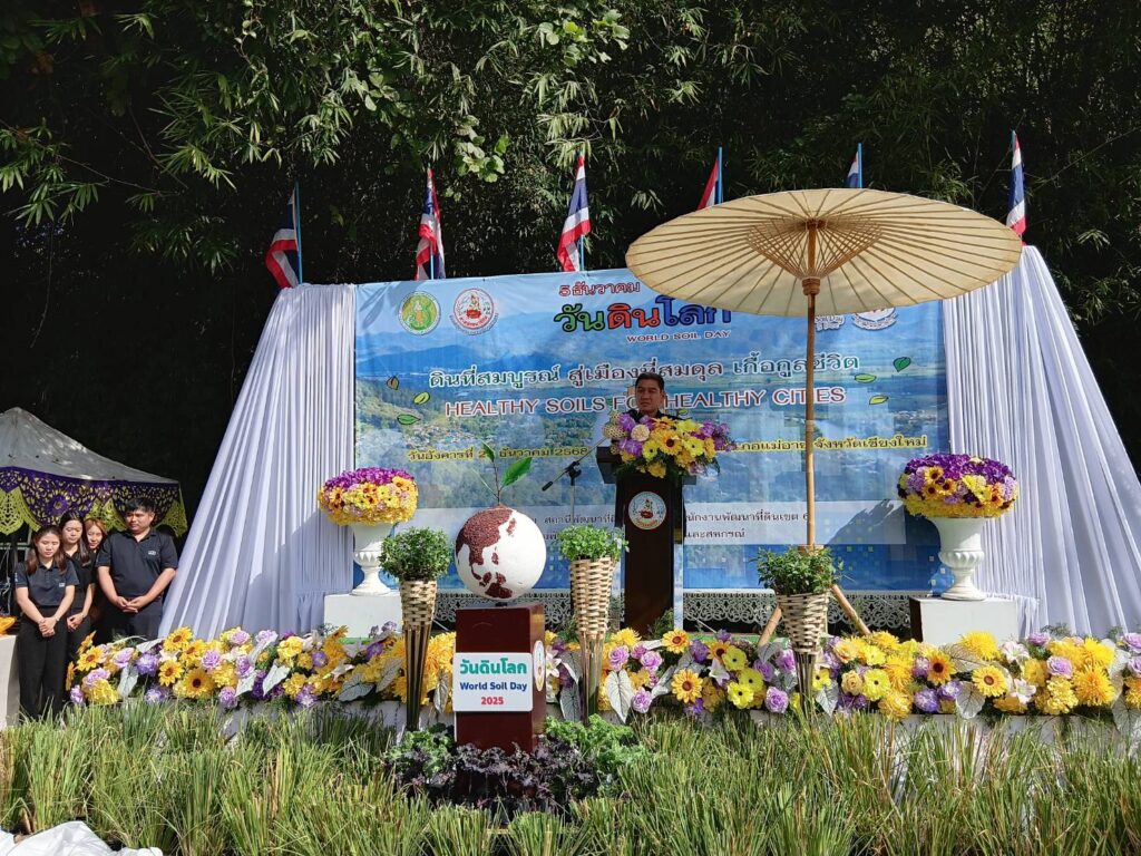 วันที่ 23 ธันวาคม 2568 นายสุมิตร วิลัยพร นักวิชาการเกษตรชำนาญการพิเศษ นายศตวรรษ บุญศรี เจ้าพนักงานธุรการปฏิบัติงาน พร้อมเจ้าหน้าที่ศูนย์วิจัยและพัฒนาการเกษตรเชียงใหม่ ร่วมงานวันดินโลก (World Soil Day) 2568 เพื่อสดุดีพระเกียรติคุณและรณรงค์ให้ตระหนักถึงความสำคัญของทรัพยากรดิน โดยมี นายทศพล เผื่อนอุดม ผู้ว่าราชการจังหวัดเชียงใหม่ เป็นประธานเปิดงาน ณ หอประชุมที่ว่าการอำเภอแม่อาย จังหวัดเชียงใหม่
