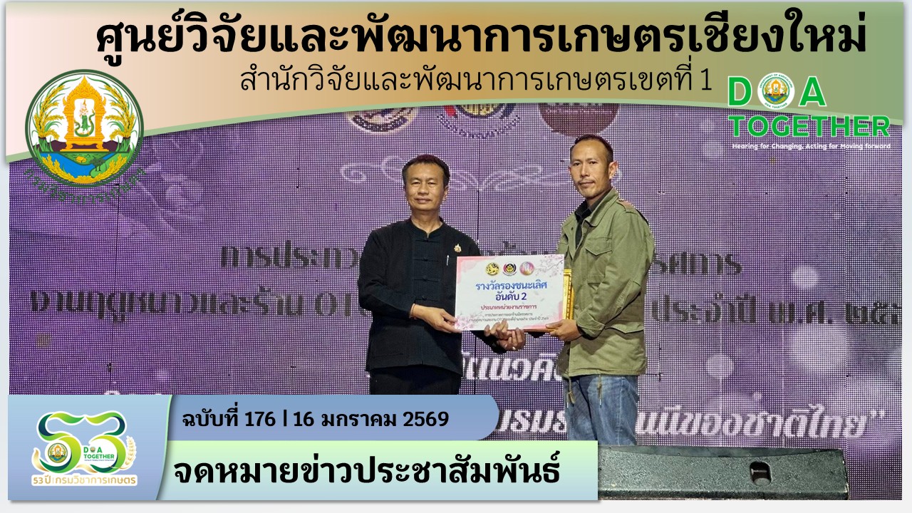 วันที่ 15 มกราคม 2569 ศูนย์วิจัยและพัฒนาการเกษตรเชียงใหม่ ได้รับรางวัล ชมเชย จากการประกวดการออกร้านนิทรรศการ ในงานฤดูหนาวและงาน OTOP ของดีอำเภอฝาง ประจำปี พ.ศ. 2569 ภายใต้แนวคิด “ใต้ร่มพระบารมี สมเด็จพระบรมราชชนนีของชาติไทย” โดยมีว่าที่ร้อยตรีนพรัตน์ ศุภกิจโกศล นายอำเภอฝาง เป็นประธานในพิธีมอบใบประกาศผลการประกวด ณ สนามกีฬาฝาง อำเภอฝาง จังหวัดเชียงใหม่