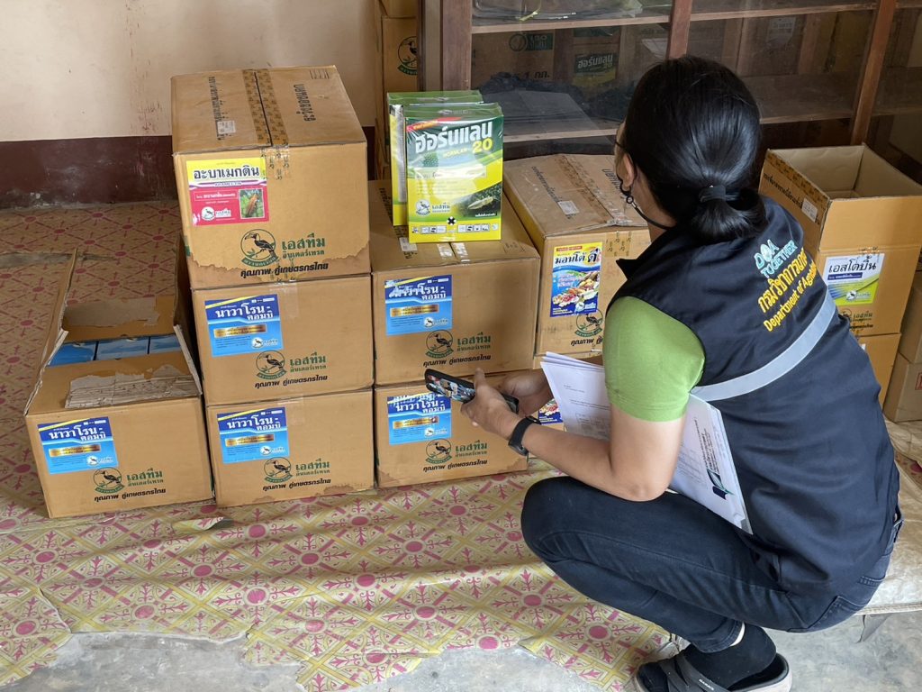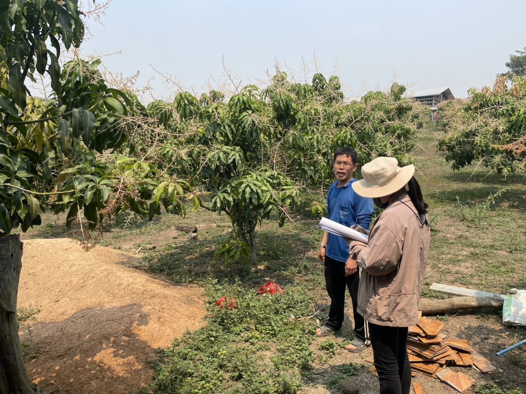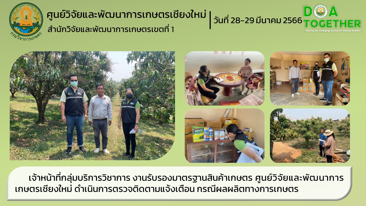 นายวิริทธิ์พล โกศล นักวิชาการเกษตร และนางวราภรณ์ ศิลาชัย พนักงานห้องทดลอง กลุ่มบริการวิชาการ งานรับรองมาตรฐานสินค้าเกษตร ศูนย์วิจัยและพัฒนาการเกษตรเชียงใหม่ ดำเนินการตรวจติดตามแจ้งเตือน กรณีผลผลิตทางการเกษตร ได้แก่ มะม่วง ส่งออกไปยังต่างประเทศพบปัญหาของเกษตรกร ตำบลเปียงหลวง อำเภอเวียงแหง จังหวัดเชียงใหม่