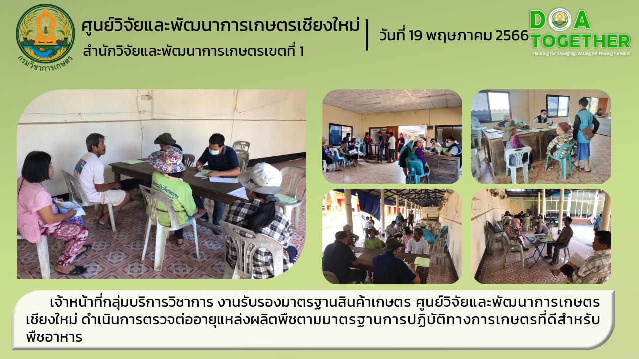กลุ่มบริการวิชาการ งานรับรองมาตรฐานสินค้าเกษตร ศูนย์วิจัยและพัฒนาการเกษตรเชียงใหม่ ได้แก่ นายวิริทธิ์พล โกศล นักวิชาการเกษตร นายฉัตรชัย คำด้วง เจ้าพนักงานการเกษตร นางวราภรณ์ ศิลาชัย พนักงานห้องทดลอง นายวิชัย เรือนคำ คนงานทดลองการเกษตร และ นายบุญสี ประพาพันธ์ คนงานทดลองการเกษตร ดำเนินการตรวจต่ออายุแหล่งผลิตพืชตามมาตรฐานการปฏิบัติทางการเกษตรที่ดีสำหรับพืชอาหาร (มกษ. 9001-2556) ของเกษตรกร โครงการพัฒนาพื้นที่สูงแบบโครงการหลวงห้วยเป้า กลุ่มเกษตรกรบ้านห้วยเป้า และกลุ่มเกษตรกรบ้านขุนคอง ตำบลเชียงดาว อำเภอเชียงดาว จังหวัดเชียงใหม่