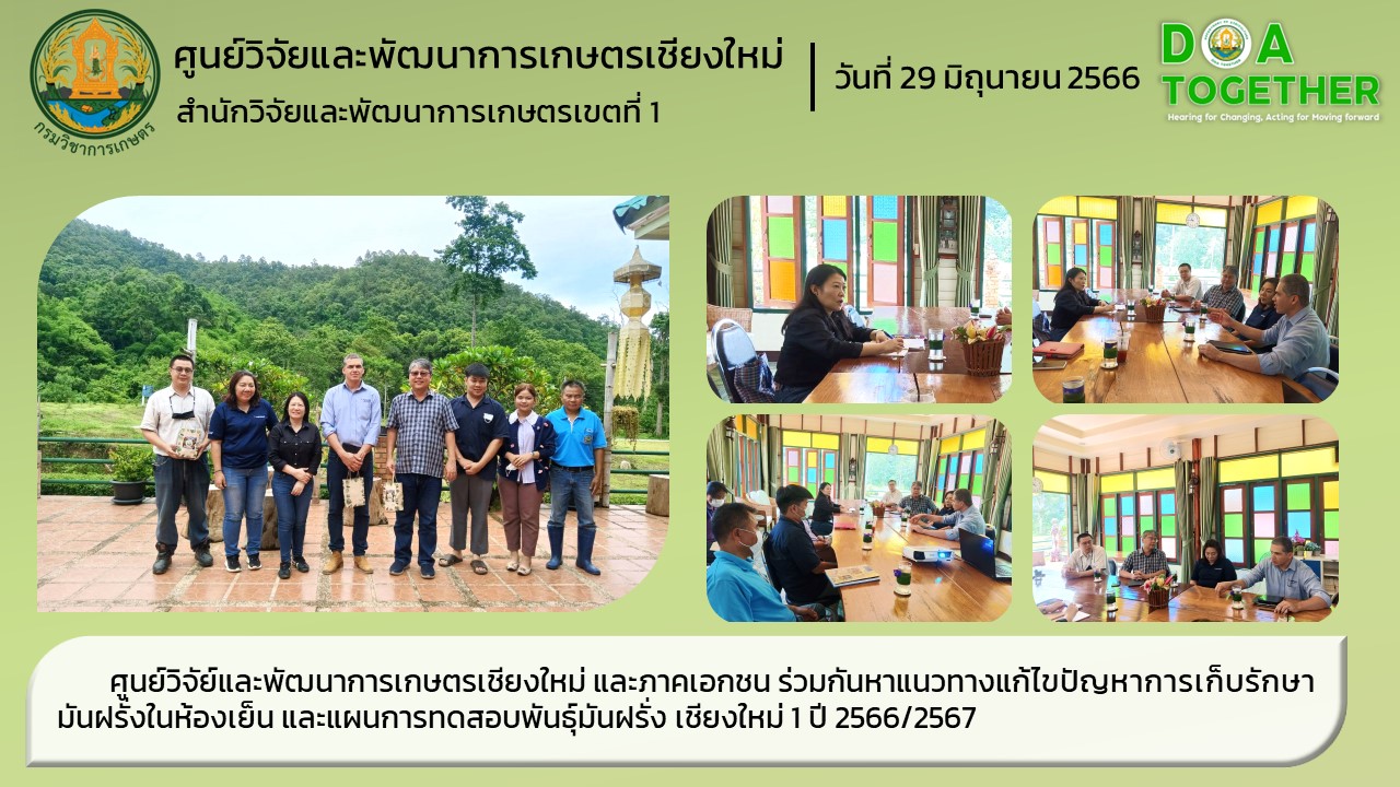นางสาวอรทัย วงค์เมธา ผู้อำนวยการศูนย์วิจัย์และพัฒนาการเกษตรเชียงใหม่ ให้การต้อนรับ นายอานนท์ สุนทรนนท์ ผู้จัดการฝ่ายเกษตรประเทศไทย นายคริสเตียโน เดอ มูรา ผู้จัดการอาวุโส APAC Seeds Varieties และเจ้าหน้าที่ จากบริษัท เป๊ปซี่-โคล่า (ไทย) เทรดดิ้ง จำกัด และร่วมปรึกษาหารือ เกี่ยวกับปัญหาการเก็บรักษามันฝรั่ง พันธุ์เชียงใหม่ 1 ในห้องเย็น และแผนการทดสอบพันธุ์มันฝรั่ง พันธุ์เชียงใหม่ 1 ในปี 2566/2567 รวมถึงแผนการพัฒนาพันธุ์มันฝรั่งเพื่อทนร้อน และต้านทานโรค โดยใช้เทคโนโลยีชีวภาพ เพื่อลดระยะเวลาการปรับปรุงพันธุ์ ณ ศูนย์วิจัยและพัฒนาการเกษตรเชียงใหม่ ตำบลโป่งน้ำร้อน อำเภอฝาง จังหวัดเชียงใหม่
