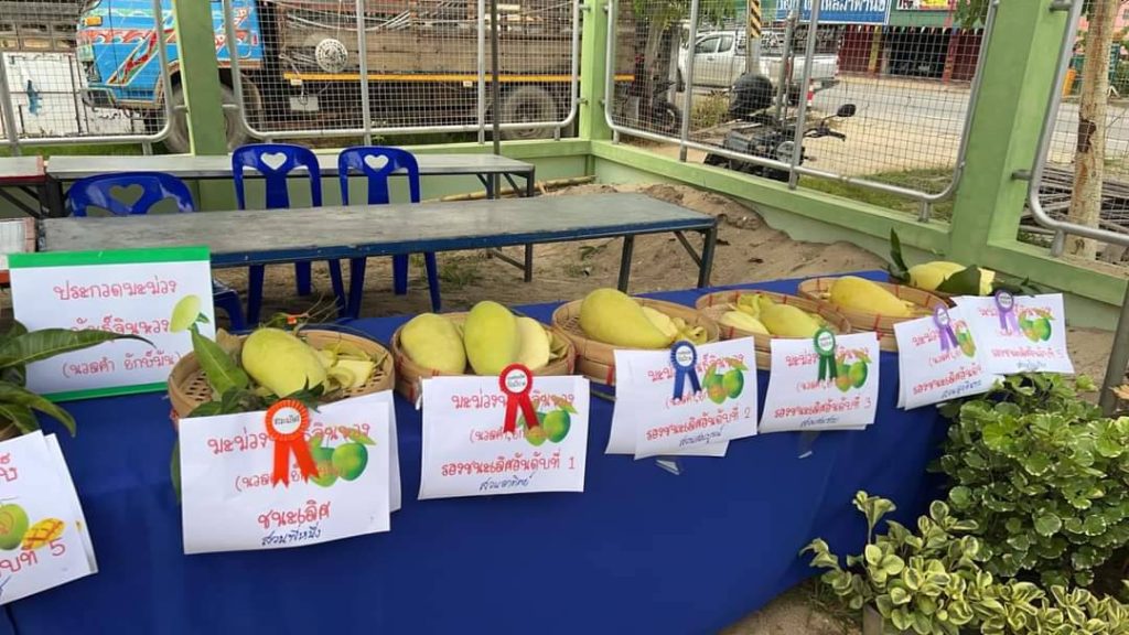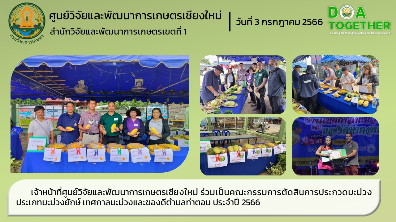 นายสุมิตร วิลัยพร นักวิชาการเกษตรชำนาญการ ศูนย์วิจัยและพัฒนาการเกษตรเชียงใหม่ ร่วมเป็นคณะกรรมการตัดสินการประกวดมะม่วง ประเภทมะม่วงยักษ์ ได้แก่ พันธุ์มหาชนก และพันธุ์จินหวง ในเทศกาลมะม่วงและของดีตำบลท่าตอน ประจำปี 2566 ณ องค์การบริหารส่วนตำบลท่าตอน อำเภอแม่อาย จังหวัดเชียงใหม่ โดยมีเกษตรกร กลุ่มวิสาหกิจชุมชนฯ เกษตรทั่วไปในพื้นที่ตำบลท่าตอน เข้าร่วม จำนวน 40 สวน