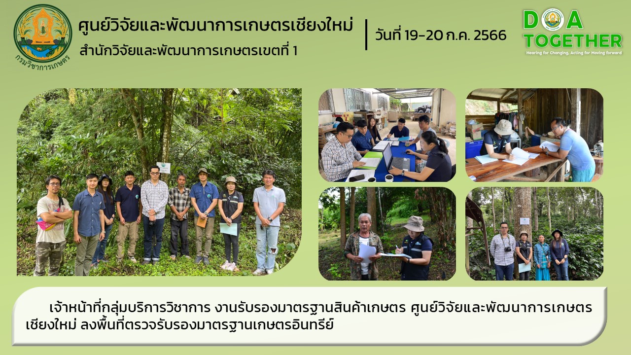 กลุ่มบริการวิชาการ งานรับรองมาตรฐานสินค้าเกษตร ศูนย์วิจัยและพัฒนาการเกษตรเชียงใหม่ ได้แก่ นายวิริทธิ์พล โกศล นักวิชาการเกษตร นายฉัตรชัย คำด้วง เจ้าพนักงานการเกษตร นางวราภรณ์ ศิลาชัย พนักงานห้องทดลอง นายวิชัย เรือนคำ เจ้าหน้าที่และ นายบุญสี ประพาพันธ์ เจ้าหน้าที่ ดำเนินการตรวจรับรองตามมาตรฐานเกษตรอินทรีย์ ของ กลุ่มกาแฟอินทรีย์ป่าแป๋ ตำบลป่าแป๋ อำเภอแม่แตง จังหวัดเชียงใหม่ เป็นกลุ่มเกษตรกรกาแฟอินทรีย์ ภายใต้การดูแลของโครงการพัฒนาพื้นที่สูงแบบโครงการหลวงป่าแป๋ สถาบันวิจัยและพัฒนาพื้นที่สูง (องค์การมหาชน)