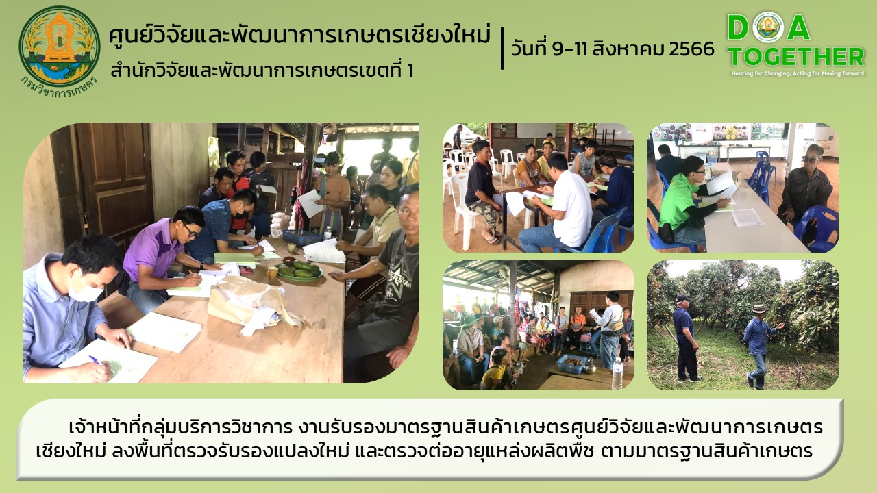 กลุ่มบริการวิชาการ งานรับรองมาตรฐานสินค้าเกษตร ศูนย์วิจัยและพัฒนาการเกษตรเชียงใหม่ ได้แก่ นายวิริทธิ์พล โกศล นักวิชาการเกษตร นายฉัตรชัย คำด้วง เจ้าพนักงานการเกษตร นางวราภรณ์ ศิลาชัย พนักงานห้องทดลอง นายวิชัย เรือนคำ เจ้าหน้าที่และ นายบุญสี ประพาพันธ์ เจ้าหน้าที่ ลงพื้นที่ตรวจรับรองแปลงใหม่ และตรวจต่ออายุแหล่งผลิตพืช ตามมาตรฐานสินค้าเกษตร การปฏิบัติทางการเกษตรที่ดีสำหรับพืชอาหาร ได้แก่ ลำไย มะม่วง ฟักทอง ของเกษตรกร อำเภอแม่แตง เชียงดาว จังหวัดเชียงใหม่ เกษตรกร รวม 140 ราย