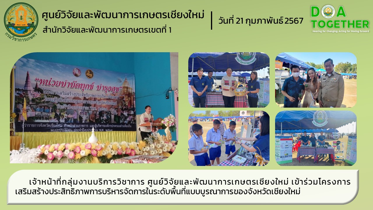 น.ส.แววดาว สมตา เจ้าพนักงานการเกษตรชำนาญงาน นายลิขิต บุตรตาพา นักวิชาการเกษตร และนายชลัมพล กันธา ช่างเครื่องกล กลุ่มงานบริการวิชาการ ศูนย์วิจัยและพัฒนาการเกษตรเชียงใหม่ เข้าร่วมโครงการเสริมสร้างประสิทธิภาพการบริหารจัดการในระดับพื้นที่แบบบูรณาการของจังหวัดเชียงใหม่ กิจกรรมย่อย “ผู้ว่าราชการจังหวัดเชียงใหม่ หัวหน้าส่วนราชการ และผู้บริหารองค์กรปกครองส่วนท้องถิ่น พบประชาชน” ประจำปีงบประมาณ พ.ศ. 2567 ณ ทศบาลตำบลไชยปราการ ตำบลปงตำ อำเภอไชยปราการ จังหวัดเชียงใหม่