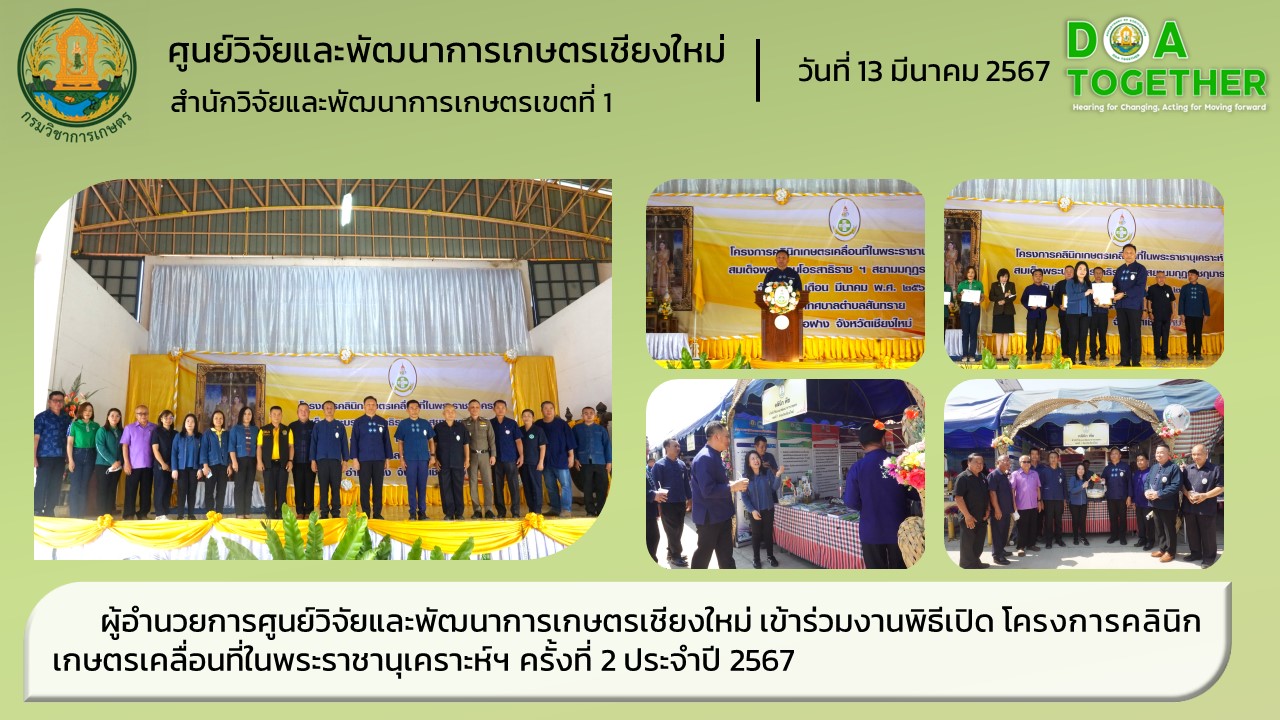นางสาวอรทัย วงค์เมธา ผู้อำนวยการศูนย์วิจัยและพัฒนาการเกษตรเชียงใหม่ พร้อมด้วยนายสุมิตร วิลัยพร นักวิชาการเกษตรชำนาญการ และเจ้าหน้าที่ศูนย์วิจัยและพัฒนาการเกษตรเชียงใหม่ เข้าร่วมงานพิธีเปิด โครงการคลินิกเกษตรเคลื่อนที่ในพระราชานุเคราะห์ สมเด็จพระบรมโอสาธิราชฯ สยามมกุฎราชกุมาร ครั้งที่ 2 ประจำปี 2567