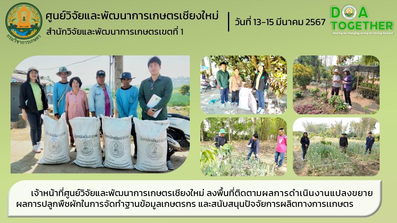 นางสาวแววดาว สมตา เจ้าพนักงานเกษตรชำนาญงาน และนายลิขิต บุตรตาพา นักวิชาการเกษตร ศูนย์วิจัยและพัฒนาการเกษตรเชียงใหม่ ลงพื้นที่ติดตามผลการดำเนินงานแปลงขยายผลการปลูกพืชผักในการจัดทำฐานข้อมูลเกษตรกร และสนับสนุนปัจจัยการผลิตทางการเเกษตร ได้แก่ ปุ๋ยหมักเติมอากาศ ภายใต้โครงการศูนย์เรียนรู้การผลิตพืชตามแนวพระราชดำริ ทฤษฏีใหม่ ณ ตำบลแม่งอน อำเภอฝาง และตำบลแม่อาย สันต้นหมอ อำเภอแม่อาย จังหวัดเชียงใหม่