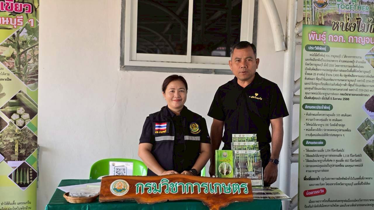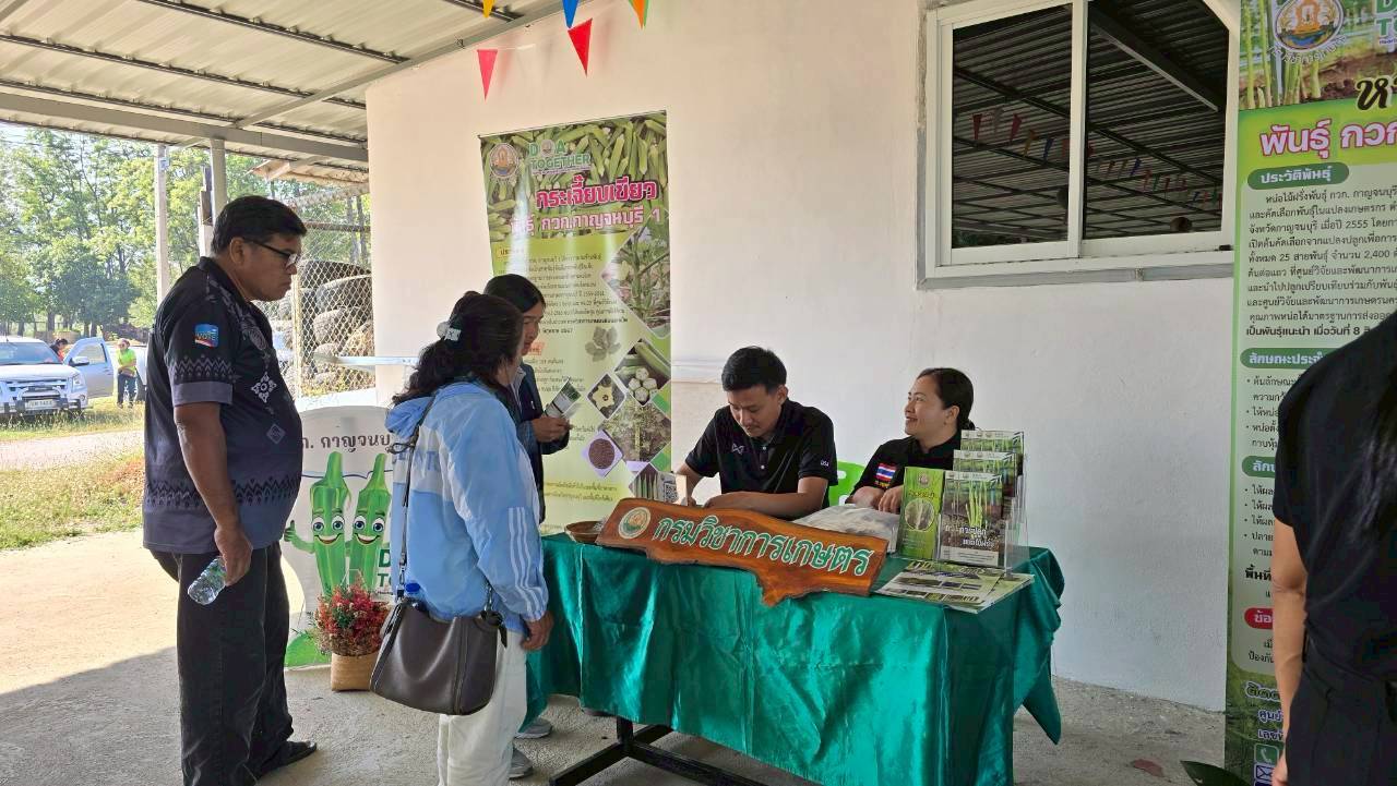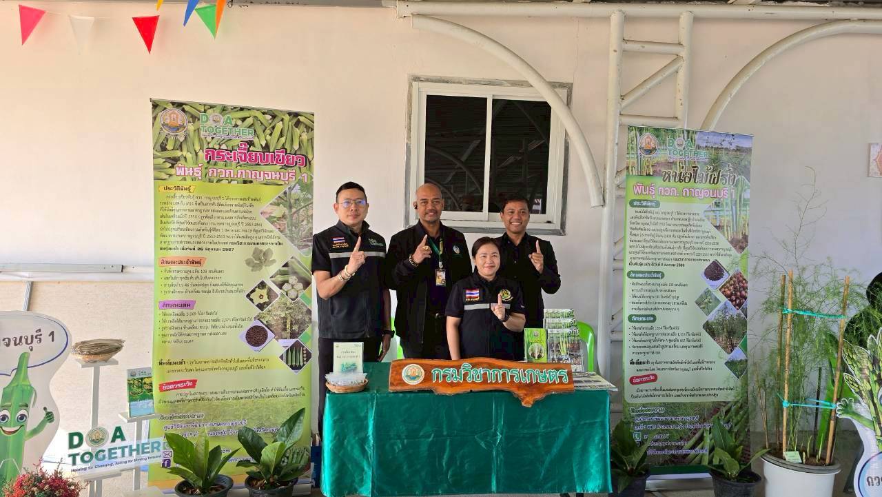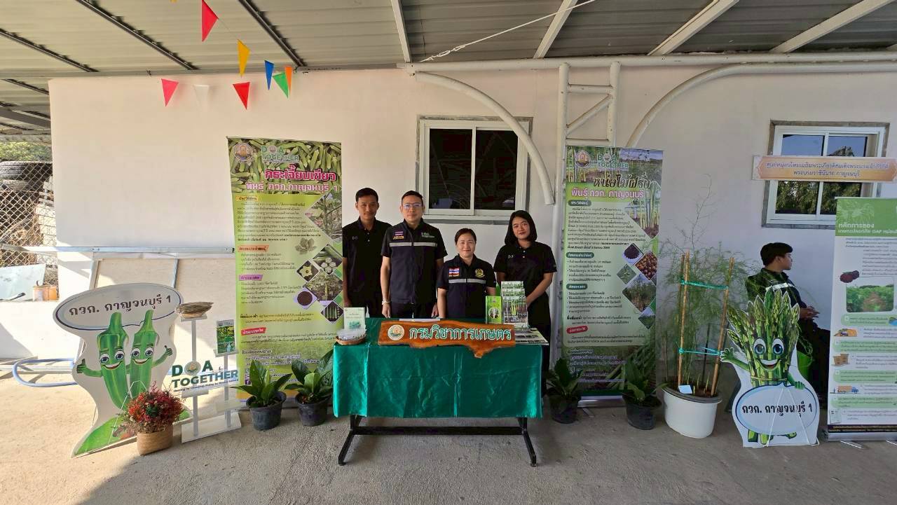 วันพฤหัสบดีที่ 12 กุมภาพันธ์ 2569 ดร.อุดมศักดิ์ ดวนมีสุข ผู้อำนวยการศูนย์วิจัยและพัฒนาการเกษตรกาญจนบุรี พร้อมด้วยนางสาวนันทนา โพธิ์สุข นักวิชาการเกษตรชำนาญการ นางสาวชฎาพิศ ไทรสังขดำรงพร นักวิชาการเกษตร และนายสมประสงค์ อ้นสี นักวิชาการเกษตร เข้าร่วมงานและร่วมจัดนิทรรศการวิชาการเผยแพร่พืชพันธุ์ดีของกรมวิชาการเกษตรได้แก่ หน่อไม้ฝรั่งพันธุ์ กวก.กาญจนบุรี 1 และกระเจี๊ยบเขียวพันธุ์ กวก.กาญจนบุรี 1 ในงานวันหมอดินอาสา ประจำปี พ.ศ. 2569 ภายใต้กิจกรรม : 3 ทศวรรษ หมอดินอาสาสืบสานคุณค่า ต่อยอดภูมิปัญญาพัฒนาดินไทย ณ สถานีพัฒนาที่ดินกาญจนบุรี ตำบลปากแพรก อำเภอเมืองกาญจนบุรี จังหวัดกาญจนบุรี
