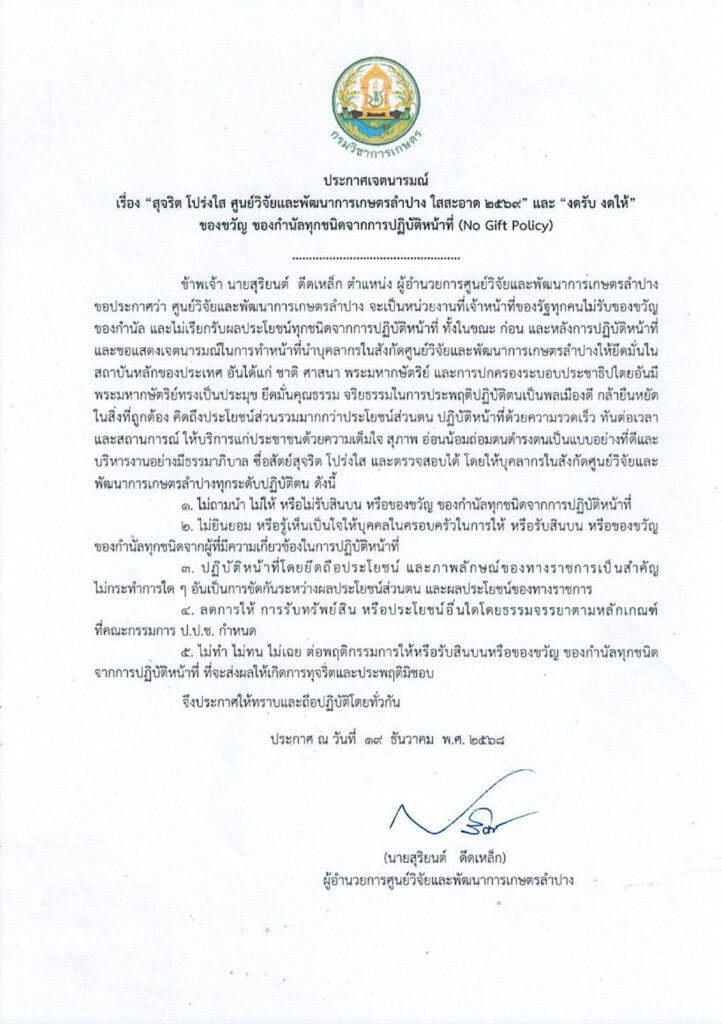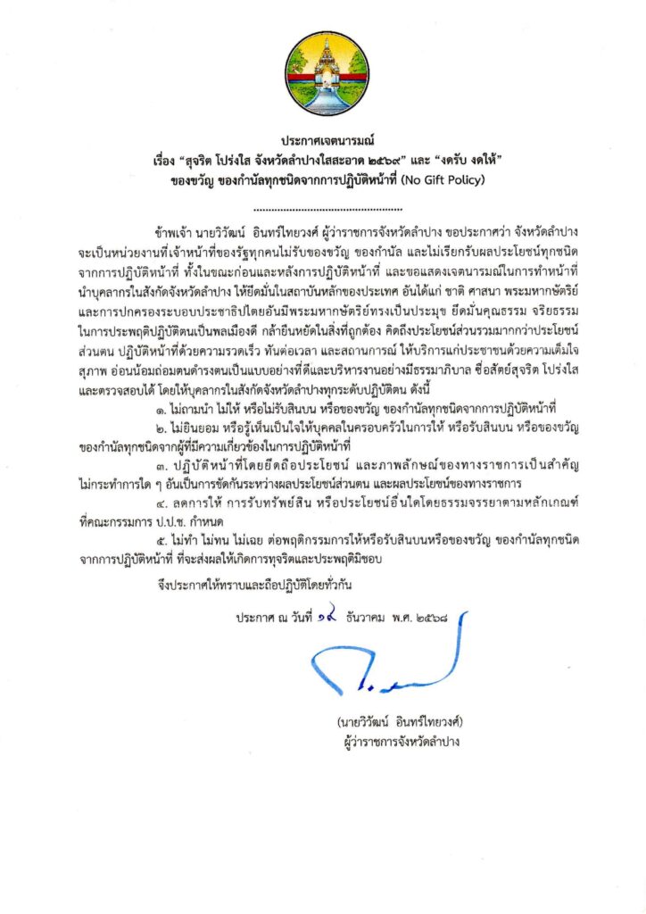 ประกาศเจตนารมณ์ สุจริต โปร่งใส จังหวัดลำปางใสสะอาด 2569 19 ธันวาคม 2568 Lampang ประชาสัมพันธ์ FacebookFacebookXXLINELine