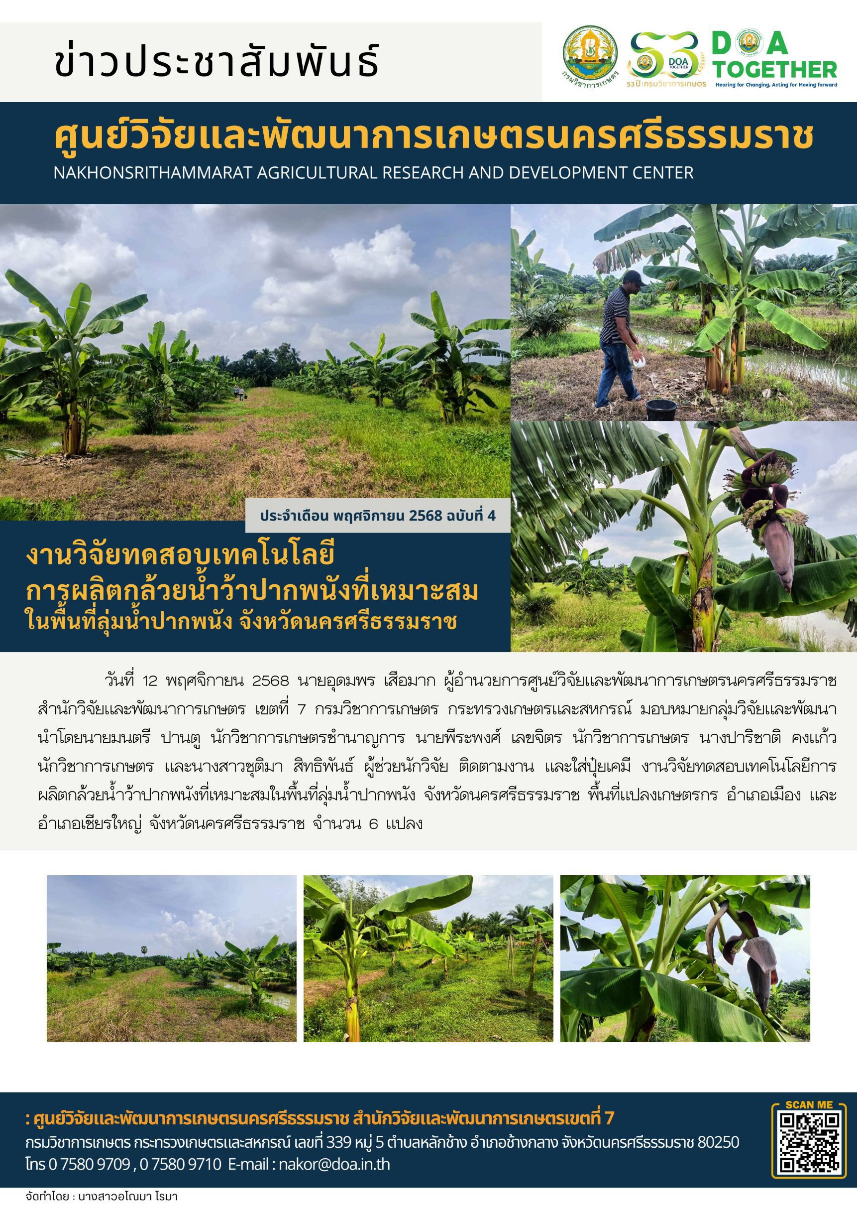 วันที่ 12 พฤศจิกายน 2568 งานวิจัยทดสอบเทคโนโลยีการผลิตกล้วยน้ำว้าปากพนังที่เหมาะสมในพื้นที่ลุ่มน้ำปากพนัง จังหวัดนครศรีธรรมราช