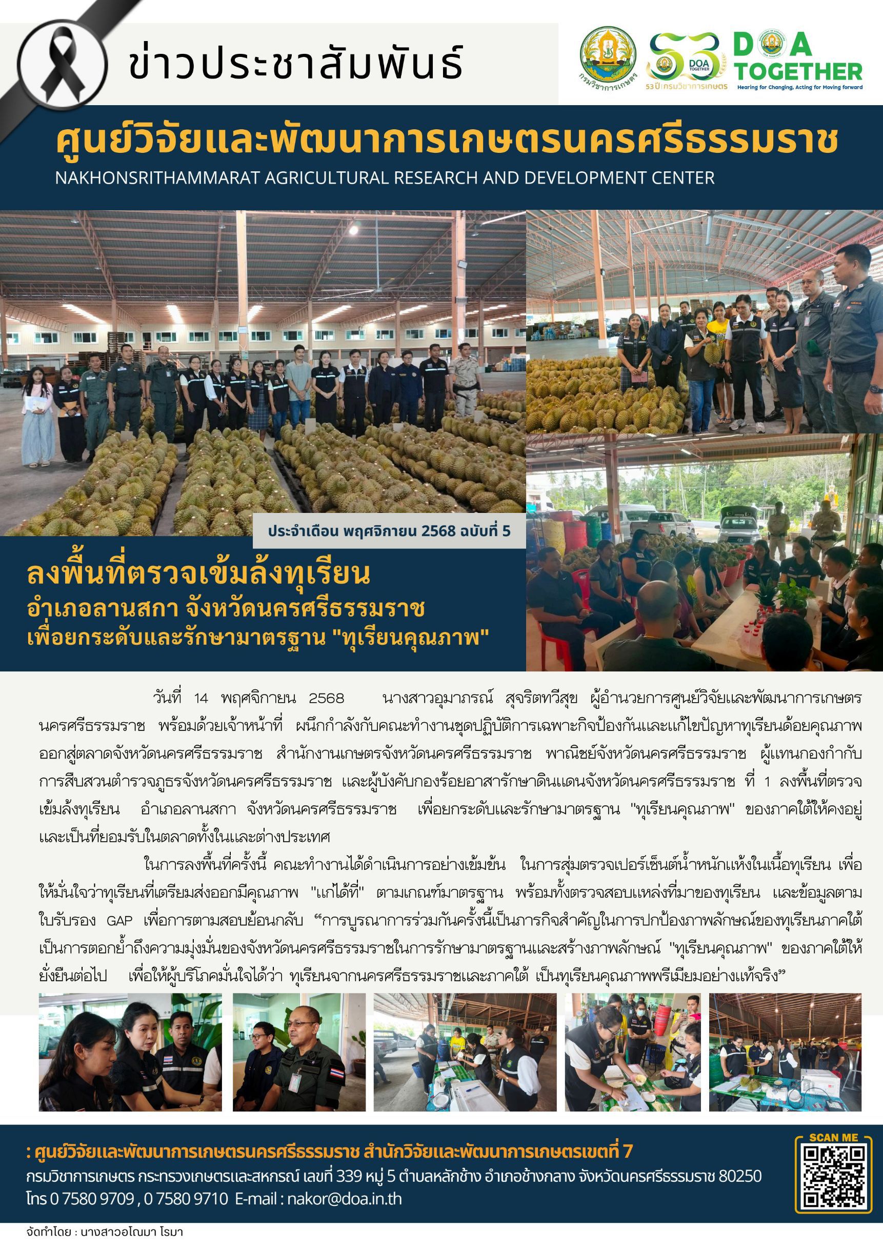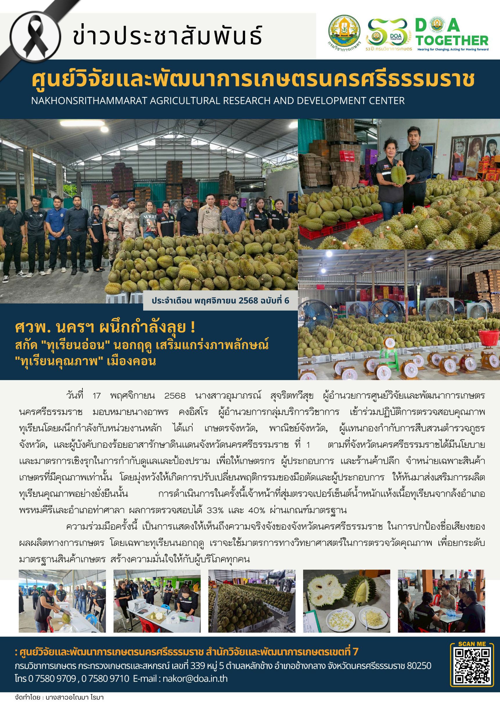 วันที่ 17 พฤศจิกายน 2568 ศวพ. นครฯ ผนึกกำลังลุย ! สกัด “ทุเรียนอ่อน” นอกฤดู เสริมแกร่งภาพลักษณ์ “ทุเรียนคุณภาพ” เมืองคอน