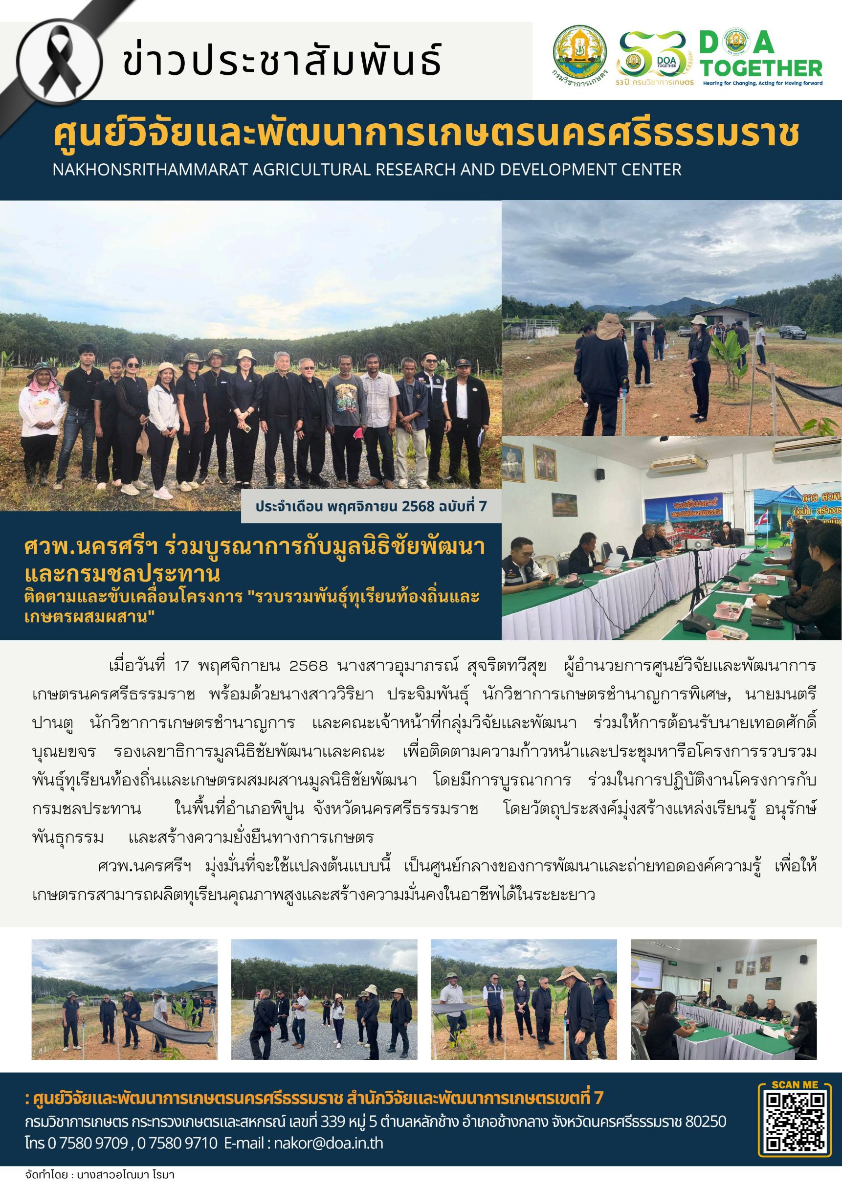 วันที่ 17 พฤศจิกายน 2568 ศวพ.นครศรีฯ ร่วมบูรณาการกับมูลนิธิชัยพัฒนาและกรมชลประทาน ติดตามและขับเคลื่อนโครงการ “รวบรวมพันธุ์ทุเรียนท้องถิ่นและเกษตรผสมผสาน”