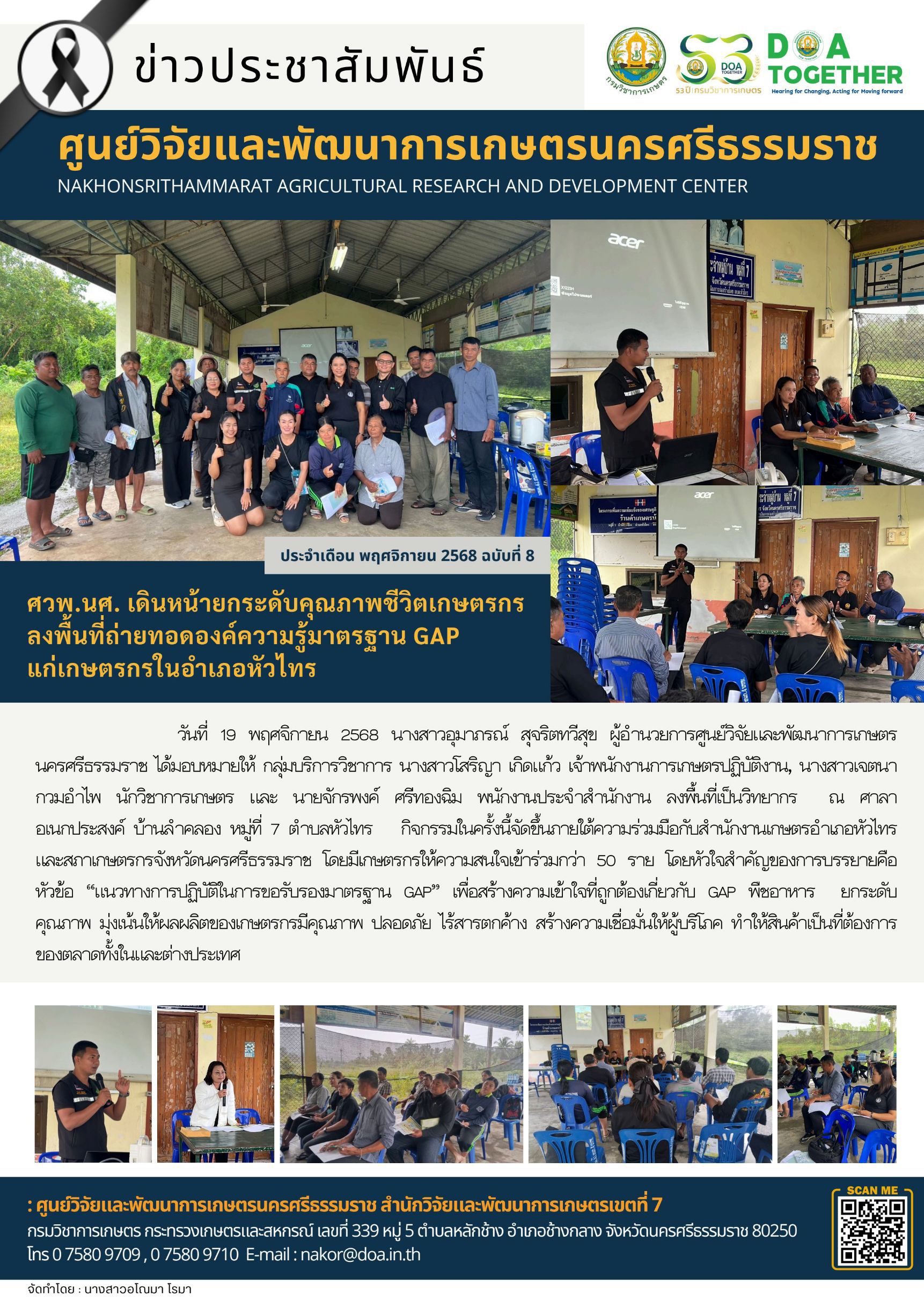 วันที่ 19 พฤศจิกายน 2568 ศวพ.นศ. เดินหน้ายกระดับคุณภาพชีวิตเกษตรกร ลงพื้นที่ถ่ายทอดองค์ความรู้มาตรฐาน GAP แก่เกษตรกรในอำเภอหัวไทร