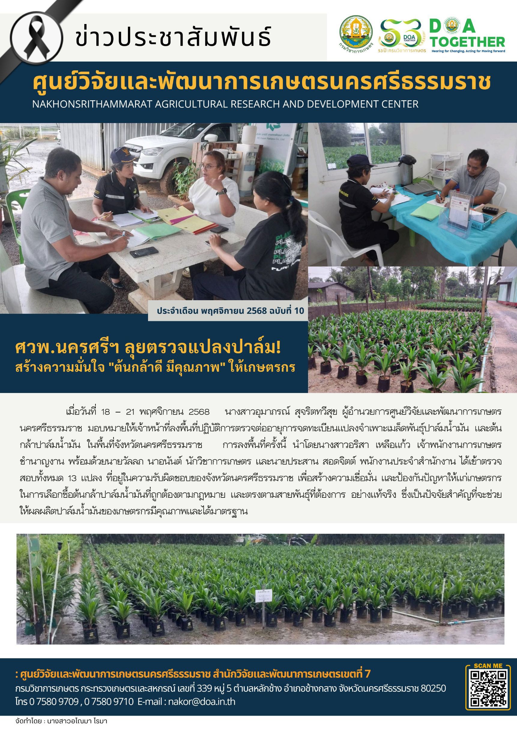 วันที่ 18-21 พฤศจิกายน 2568 ศวพ.นครศรีฯ ลุยตรวจแปลงปาล์ม! สร้างความมั่นใจ “ต้นกล้าดี มีคุณภาพ” ให้เกษตรกร