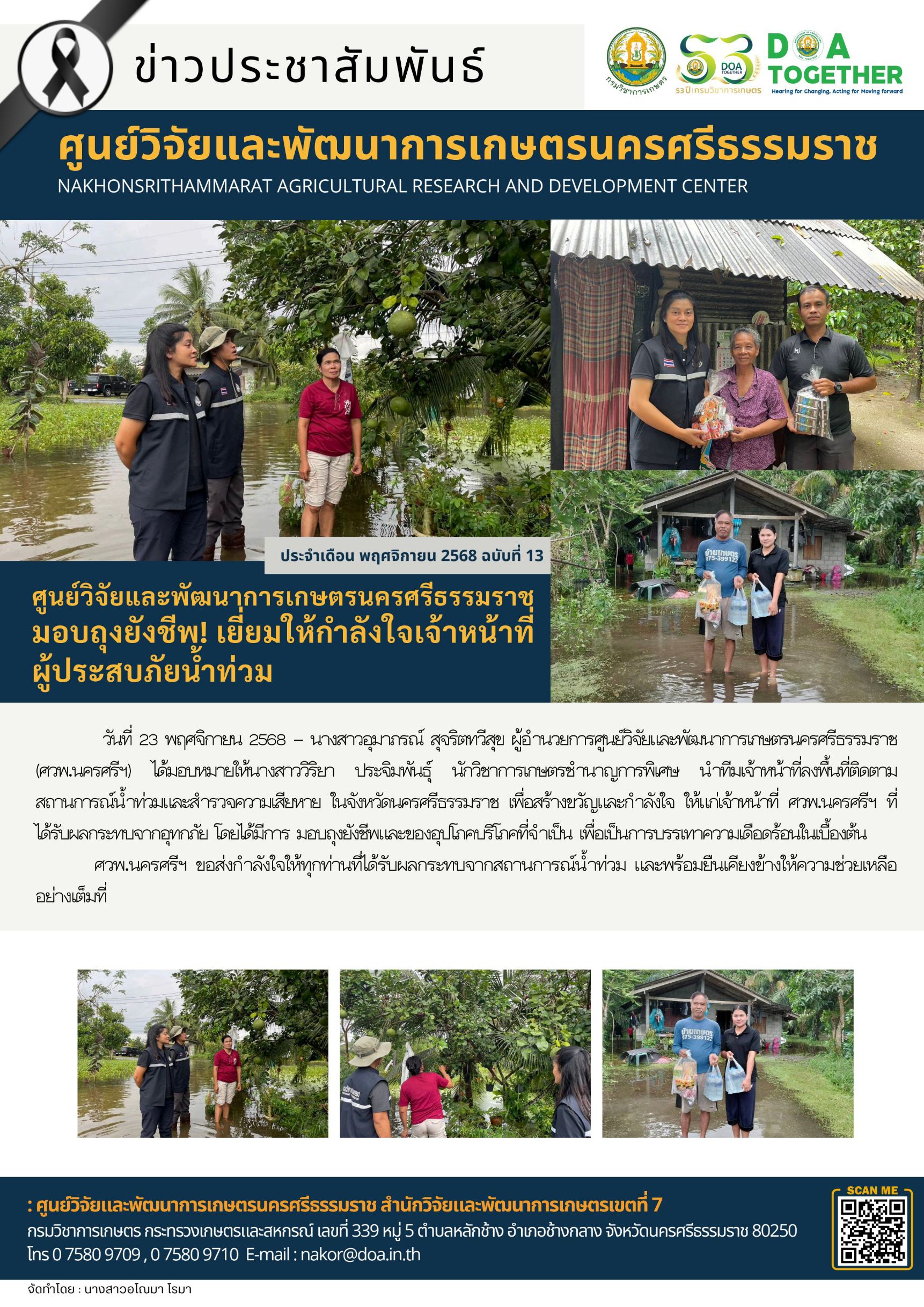 วันที่ 23 พฤศจิกายน 2568 ศูนย์วิจัยและพัฒนาการเกษตรนครศรีธรรมราช มอบถุงยังชีพ! เยี่ยมให้กำลังใจเจ้าหน้าที่ผู้ประสบภัยน้ำท่วม