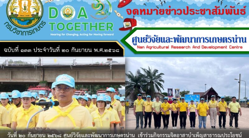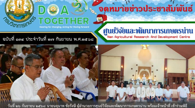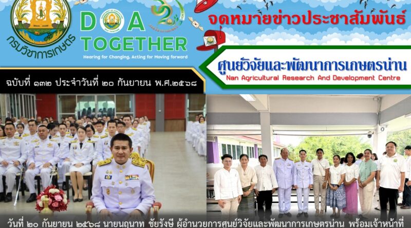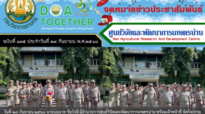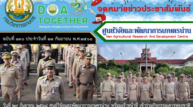 กลุ่มบริการวิชาการกลุ่มบริหารงานทั่วไปกลุ่มวิจัยและพัฒนาข่าวประชาสัมพันธ์ 29 กันยายน 2568 adminnan วันที่ 29 กันยายน 2568 ศูนย์วิจัยและพัฒนาการเกษตรน่าน พร้อมเจ้าหน้าที่ เข้าร่วมกิจกรรมเคารพธงชาติและร้องเพลงชาติไทย เนื่องในวันพระราชทานธงชาติไทย (Thai National Flag Day) ประจำปี 2568 เมื่อวันที่ 20 ฯ วันที่ 29 กันยายน 25 Read More