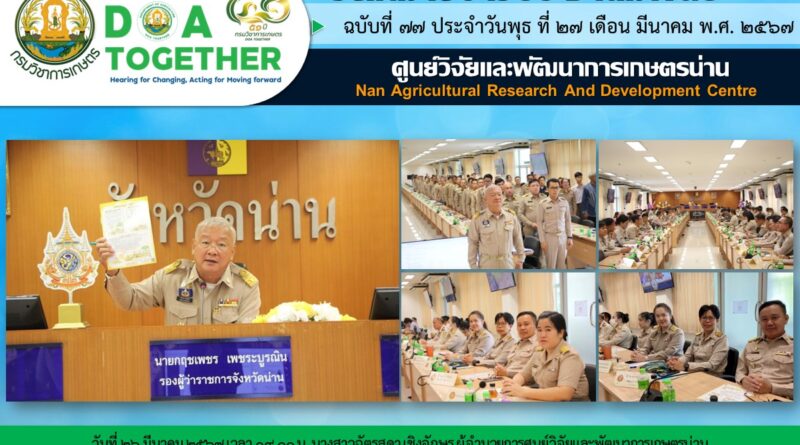 กลุ่มบริหารงานทั่วไปข่าวประชาสัมพันธ์ 27 มีนาคม 2567 adminnan วันที่ 26 มีนาคม 2567 เวลา 09.00 น. นางสาวฉัตรสุดา เชิงอักษร ผู้อำนวยการศูนย์วิจัยและพัฒนาการเกษตรน่าน เข้าร่วมการประชุมคณะกรมการจังหวัดหัวหน้าส่วนราชการ และหัวหน้าหน่วยงานที่เกี่ยวข้อง ประจำเดือนมีนาคม 2567 ฯ วันที่ 26 มีนาคม 256 Read More
