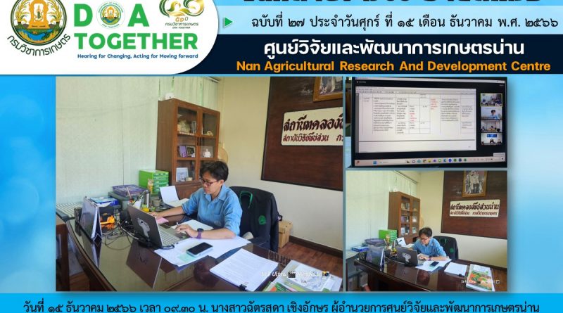 กลุ่มบริหารงานทั่วไปข่าวประชาสัมพันธ์ 15 ธันวาคม 2566 adminnan วันที่ 15 ธันวาคม 2566 เวลา 09.30 น. นางสาวฉัตรสุดา เชิงอักษร ผู้อำนวยการศูนย์วิจัยและพัฒนาการเกษตรน่าน เข้าร่วมประชุมคณะอนุกรรมการด้านการเกษตรโครงการศูนย์ภูฟ้าพัฒนาอันเนื่องมาจากพระราชดำริฯ วันที่ 15 ธันวาคม 25 Read More