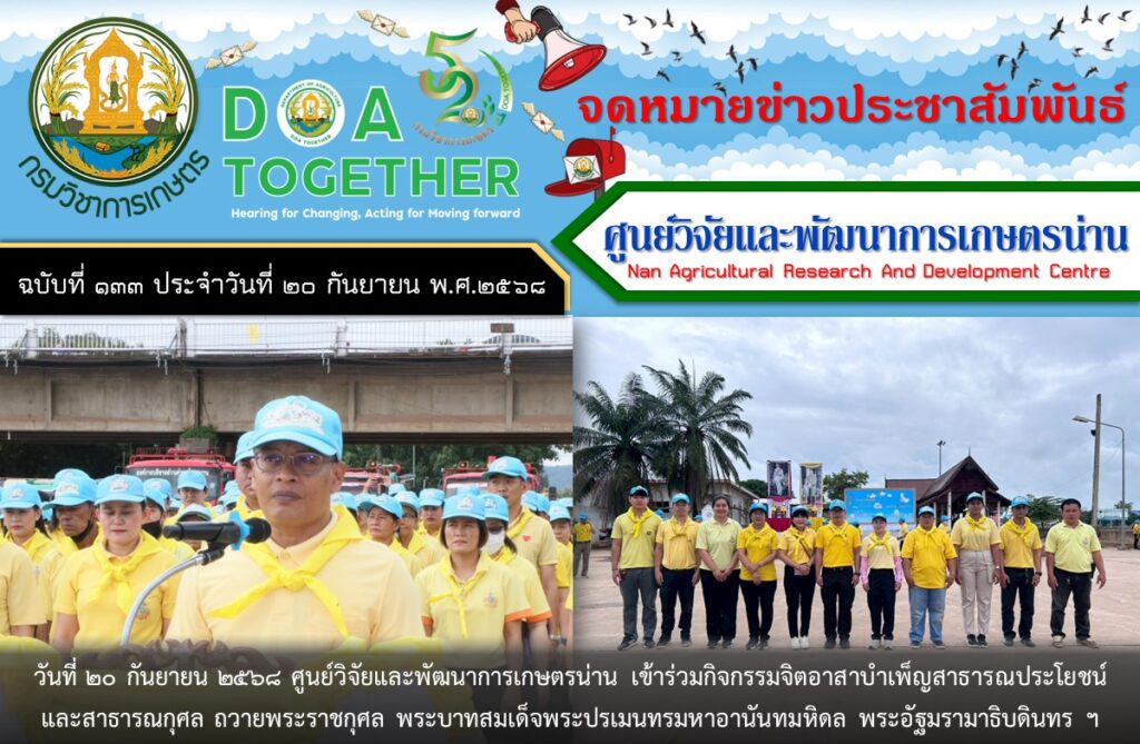 วันที่ 20 กันยายน 2568 ศูนย์วิจัยและพัฒนาการเกษตรน่าน เข้าร่วมกิจกรรมจิตอาสาบำเพ็ญสาธารณประโยชน์และสาธารณกุศล ถวายพระราชกุศล พระบาทสมเด็จพระปรเมนทรมหาอานันทมหิดล พระอัฐมรามาธิบดินทร เนื่องในโอกาสวันพระบรมราชสมภพครบ 100 ปี 20 กันยายน 2568 เพื่อร่วมกันแสดงออกถึงความจงรักภักดี และสำนึกในพระมหากรุณาธิคุณ ในโอกาสวันสำคัญของชาติไทย “วันอานันทมหิดล” โดยมี นายบรรจง ขุนเพชร รองผู้ว่าราชการจังหวัดน่าน เป็นประธานเปิดกิจกรรม ณ ลานรวมใจ เชิงสะพานพัฒนาภาคเหนือ