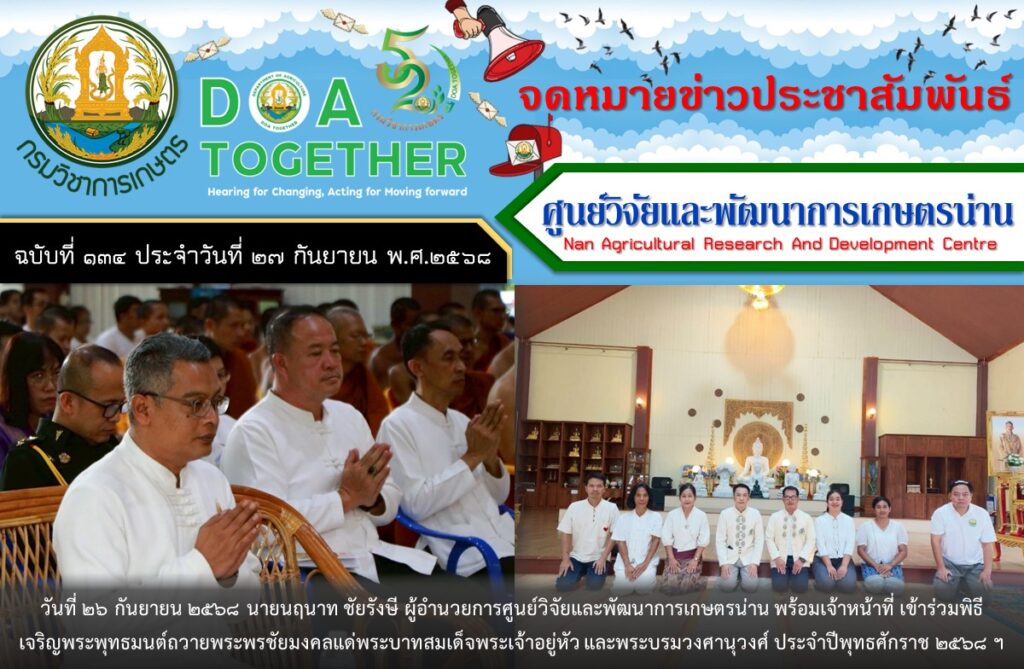 วันที่ 26 กันยายน 2568 นายนฤนาท ชัยรังษี ผู้อำนวยการศูนย์วิจัยและพัฒนาการเกษตรน่าน พร้อมเจ้าหน้าที่ เข้าร่วมพิธีเจริญพระพุทธมนต์ถวายพระพรชัยมงคลแด่พระบาทสมเด็จพระเจ้าอยู่หัว และพระบรมวงศานุวงศ์ ประจำปีพุทธศักราช 2568 โดยมี พระครูกิตติจันทโรภาส เจ้าคณะอำเภอเมืองน่าน ธรรมยุต เจ้าอาวาสวัดป่านันทบุรีญาณสังวราราม เป็นประธานฝ่ายสงฆ์ และ นายบรรจง ขุนเพชร รองผู้ว่าราชการจังหวัดน่าน เป็นประธานฝ่ายฆราวาส พร้อมคณะสงฆ์จังหวัดน่าน ศาล ทหาร ตำรวจ หัวหน้าส่วนราชการ ข้าราชการ พนักงานรัฐวิสาหกิจ ภาคเอกชน และพุทธศาสนิกชนเข้าร่วมอย่างพร้อมเพรียง ณ วัดป่านันทบุรีญาณสังวราราม ตำบลผาสิงห์ อำเภอเมืองน่าน จังหวัดน่าน