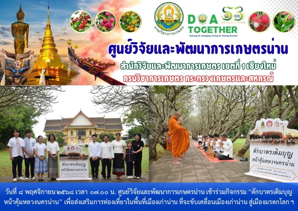 วันที่ 8 พฤศจิกายน 2568 เวลา 07.00 น. ศูนย์วิจัยและพัฒนาการเกษตรน่าน เข้าร่วมกิจกรรม “ตักบาตรเติมบุญ หน้าคุ้มหลวงนครน่าน” เพื่อส่งเสริมการท่องเที่ยวในพื้นที่เมืองเก่าน่าน ที่จะขับเคลื่อนเมืองเก่าน่าน สู่เมืองมรดกโลก และส่งเสริมให้พุทธศาสนิกชนชาวไทยได้ปฏิบัติกิจกรรมทางพระพุทธศาสนาถวายเป็นพุทธบูชา เพื่อขัดเกลาจิตใจให้เป็นบุคคลที่มีคุณธรรมจริยธรรม สามารถดำรงชีวิตอยู่ในสังคมได้อย่างมีความสุข พร้อมด้วยหัวหน้าส่วนราชการ เข้าร่วมพิธีอย่างพร้อมเพียงกัน โดยมีนายบรรจง ขุนเพชร รองผู้ว่าราชการจังหวัดน่าน เป็นประธานในการจัดกิจกรรม ณ บริเวณหน้าพิพิธภัณฑสถานแห่งชาติน่าน ตำบลในเวียง อำเภอเมืองน่าน จังหวัดน่าน
