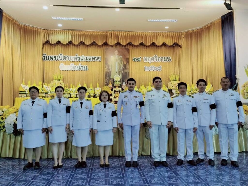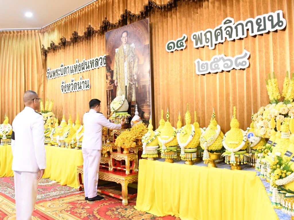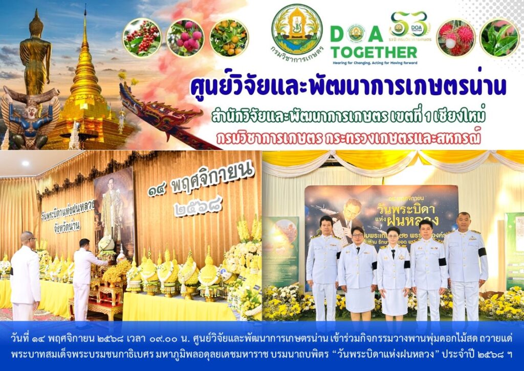 วันที่ 14 พฤศจิกายน 2568 เวลา 09.00 น. ศูนย์วิจัยและพัฒนาการเกษตรน่าน เข้าร่วมกิจกรรมวางพานพุ่มดอกไม้สด ถวายแด่พระบาทสมเด็จพระบรมชนกาธิเบศร มหาภูมิพลอดุลยเดชมหาราช บรมนาถบพิตร “วันพระบิดาแห่งฝนหลวง” ประจำปี 2568 น้อมรำลึกในพระมหากรุณาธิคุณ ในหลวงรัชกาลที่ 9 พระองค์ทรงคิดค้นฝนเทียม เพื่อช่วยเหลือพสกนิกรชาวไทยในพื้นที่ประสบภัยแล้ง โดยมี นายชัยนรงค์ วงศ์ใหญ่ ผู้ว่าราชการจังหวัดน่าน เป็นประธานในพิธี พร้อมด้วยข้าราชการตุลาการ ทหาร ตำรวจ อัยการ องค์กรอิสระ บุคลากรภาครัฐและภาคเอกชน ณ ห้องประชุมสำนักงานเขตพื้นที่การศึกษาประถมศึกษาน่าน เขต 1 อำเภอเมืองน่าน จังหวัดน่าน