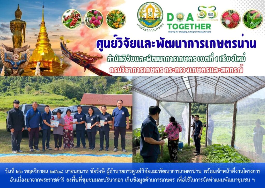 วันที่ 26 พฤศจิกายน 2568 นายนฤนาท ชัยรังษี ผู้อำนวยการศูนย์วิจัยและพัฒนาการเกษตรน่าน พร้อมเจ้าหน้าที่งานโครงการอันเนื่องมาจากพระราชดำริ ลงพื้นที่ชุมชนมละบรินากอก เก็บข้อมูลด้านการเกษตร เพื่อใช้ในการจัดทำแผนพัฒนาชุมชนมละบรินากอก ด้านการพัฒนาอาชีพ พบว่า มีจำนวนประชากร 80 ราย 20 ครัวเรือน ในพื้นที่ชุมชนมีการจัดทำแปลงปลูกพืชผัก ได้แก่ พริก มะละกอ พืชหัว กล้วย กะหล่ำปลี ผักกาดขาว มะเขือ ฯลฯ รวมถึงนาข้าว ปัจจัยการผลิตฯ ยังเป็นการจัดซื้อจากภายนอก เช่น เมล็ดพันธุ์ ต้นกล้า และประชากรมีความรู้ด้านการปลูกพืชผัก ซึ่งจะได้นำไปจัดทำแผนพัฒนาตามแนวทางคณะทำงานขับเคลื่อนการพัฒนาคุณภาพชีวิตชนเผ่ามละบริ จังหวัดน่าน ต่อไป ทั้งนี้ ศวพ.น่าน ได้มอบเมล็ดพันธุ์ผักพันธุ์ดี ของกรมวิชาการเกษตร เพื่อปลูกบริโภค และยังสามารถเก็บขยายพันธุ์ต่อได้แก่ผู้แทนชุมชน มละบรินากอก บ้านนากอก ตำบลภูฟ้า อำเภอบ่อเกลือ จังหวัดน่าน