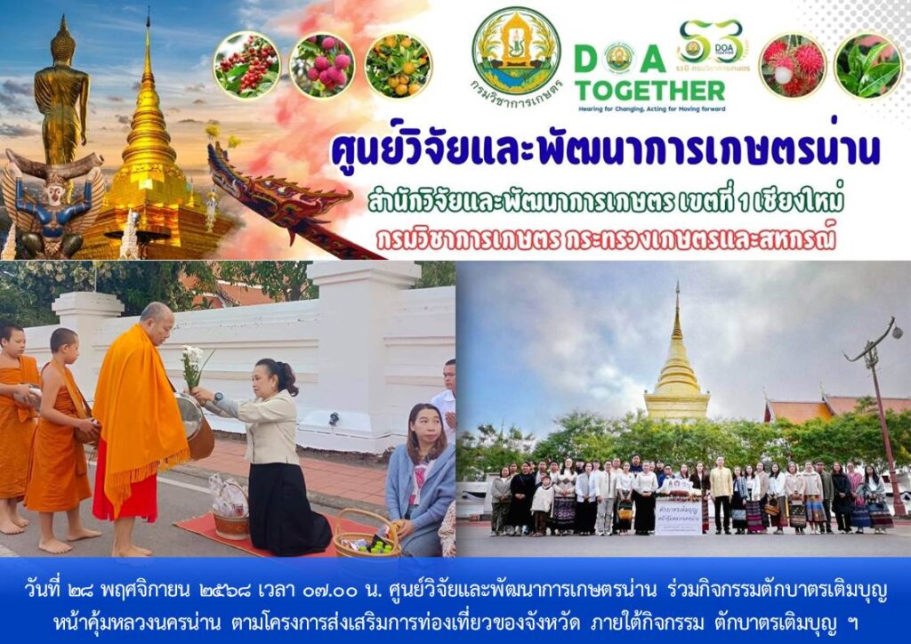 วันที่ 28 พฤศจิกายน 2568 เวลา 07.00 น. ศูนย์วิจัยและพัฒนาการเกษตรน่าน ร่วมกิจกรรมตักบาตรเติมบุญ หน้าคุ้มหลวงนครน่าน ตามโครงการส่งเสริมการท่องเที่ยว ของจังหวัด ภายใต้กิจกรรม ตักบาตรเติมบุญ หน้าคุ้มหลวงนครน่าน และส่งเสริมให้เกิด การท่องเที่ยวในพื้นที่เมืองเก่าน่านที่จะขับเคลื่อนเมืองเก่าน่าน สู่เมืองมรดกโลก โดยมี นางวิไลวรรณ บุดาสา รองผู้ว่าราชการจังหวัดน่าน หน่วยงานในสังกัดกระทรวงเกษตรและสหกรณ์ นักท่องเที่ยว และพุทธศาสนิกชนชาวน่าน ร่วมกิจกรรม ณ บริเวณถนนหน้าพิพิธภัณฑสถานแห่งชาติน่าน