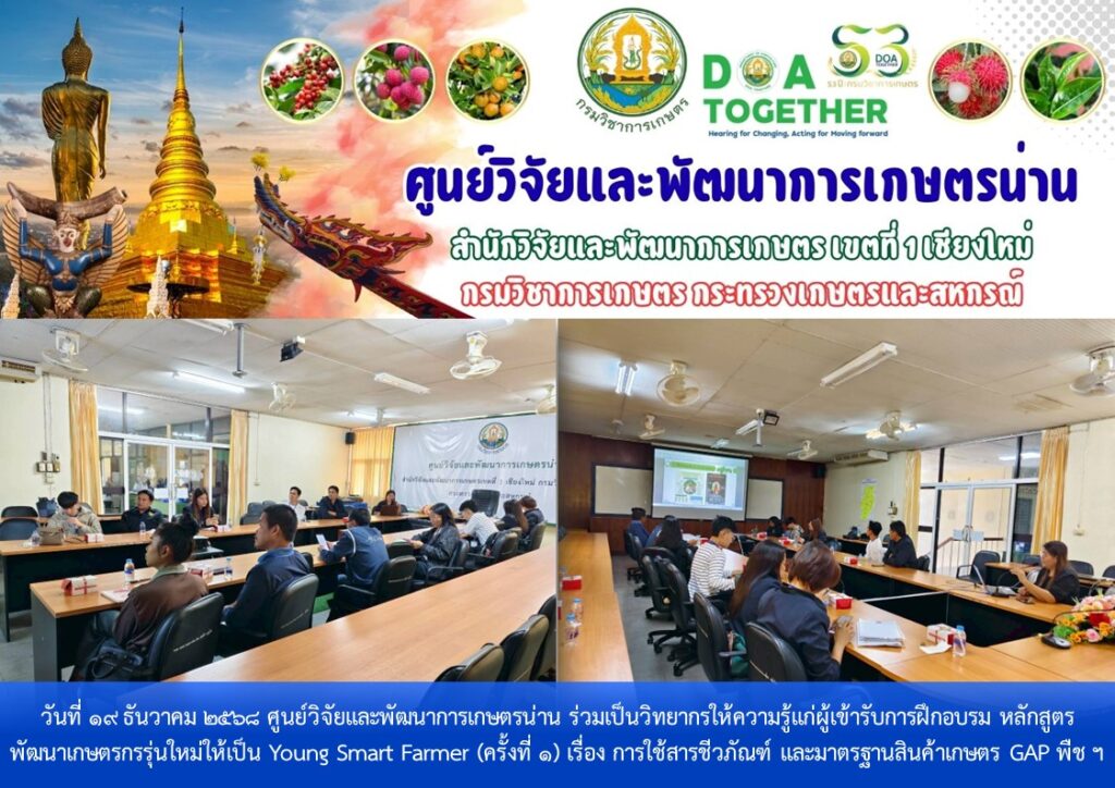 วันที่ 19 ธันวาคม 2568 ศูนย์วิจัยและพัฒนาการเกษตรน่าน ร่วมเป็นวิทยากรให้ความรู้แก่ผู้เข้ารับการฝึกอบรม หลักสูตร พัฒนาเกษตรกรรุ่นใหม่ให้เป็น Young Smart Farmer (ครั้งที่ 1) เรื่อง การใช้สารชีวภัณฑ์ และมาตรฐานสินค้าเกษตร GAP พืช จำนวน 20 ราย โดยกรมส่งเสริมการเกษตร มอบหมายให้สำนักงานเกษตรจังหวัดน่าน ดำเนินงานโครงการพัฒนาทักษะและแนวคิดผู้ประกอบธุรกิจเกษตร เกษตรกรปราดเปรี่อง (Smart Farmer) ประจำปีงบประมาณ 2569 กิจกรรมพัฒนาเกษตรกรปราดเปรี่องและเกษตรกรรุ่นใหม่ (Smart Farmer & Young Smart Farmer) เพื่อส่งเสริมเกษตรกรรุ่นใหม่ที่มีศักยภาพด้านการผลิต การตลาดและการบริหารจัดการ ตลอดจนเชื่อมโยงเครือข่ายเกษตรกรรุ่นใหม่ให้เกิดการแลกเปลี่ยนเรียนรู้ในเชิงพัฒนาด้านวิชาการ การผลิต การตลาด สามารถช่วยเหลือเกื้อกูลกันได้ ณ ห้องประชุม ศูนย์วิจัยและพัฒนาการเกษตรน่าน หมู่ 1 ตำบลผาสิงห์ อำเภอเมืองน่าน จังหวัดน่าน
