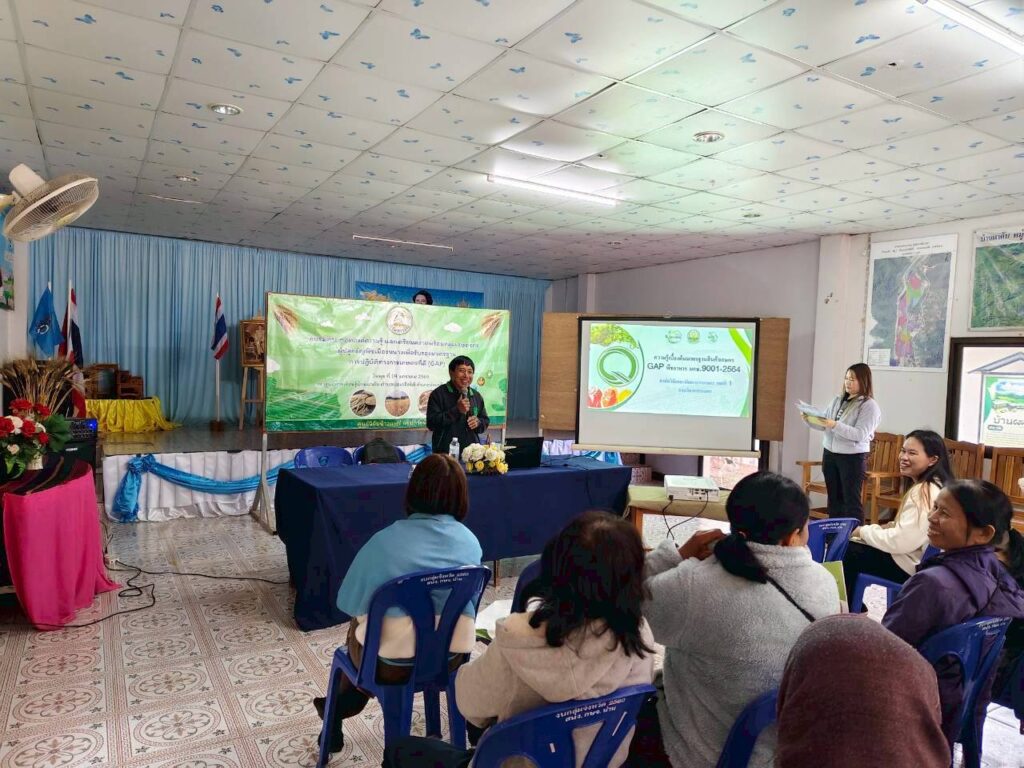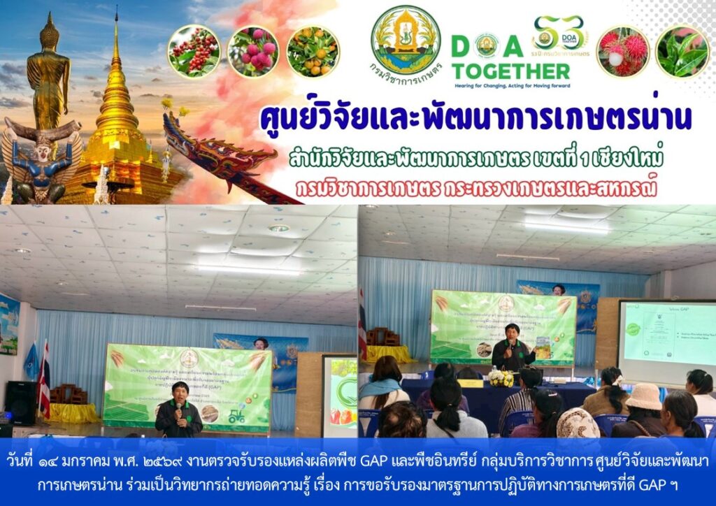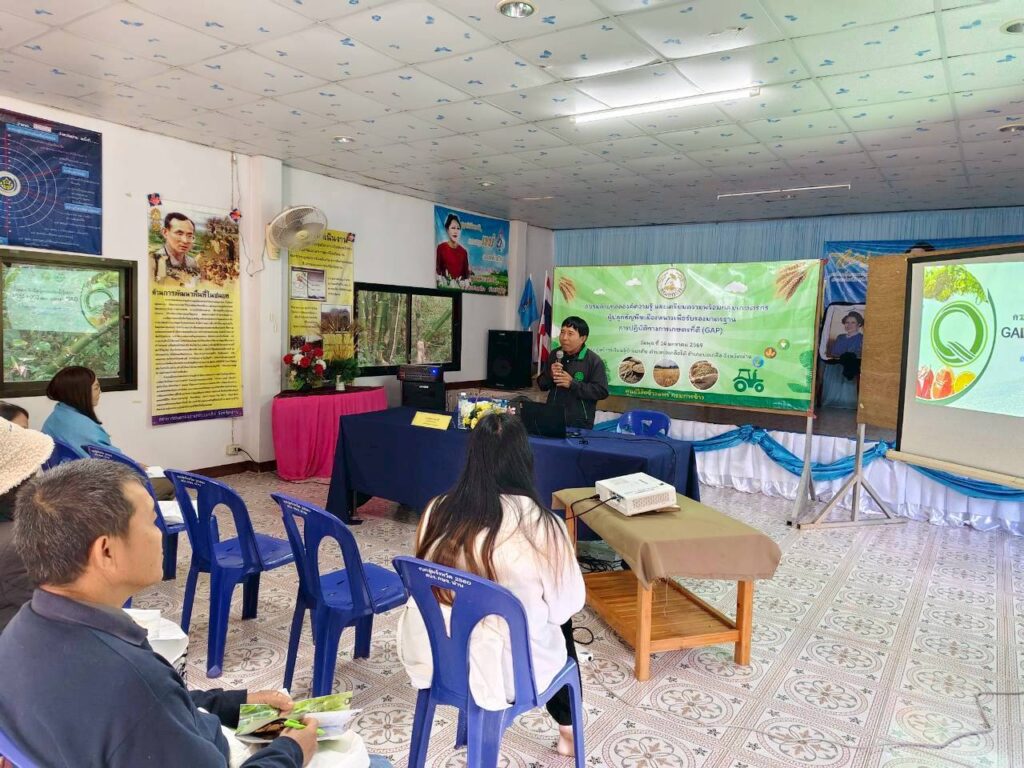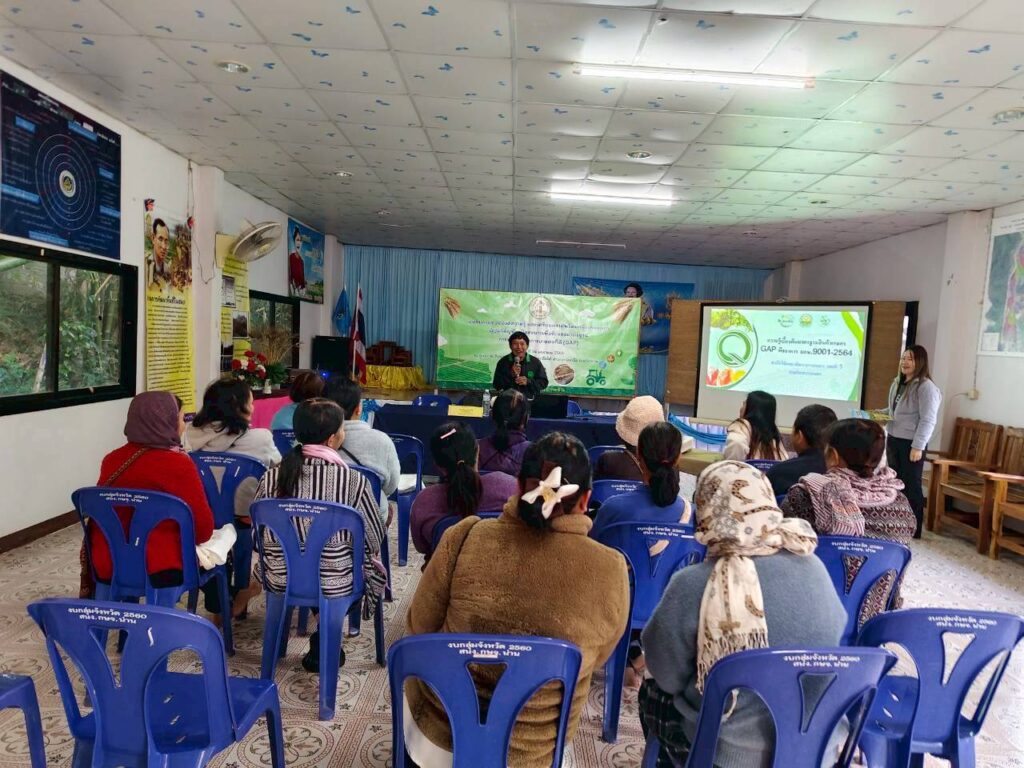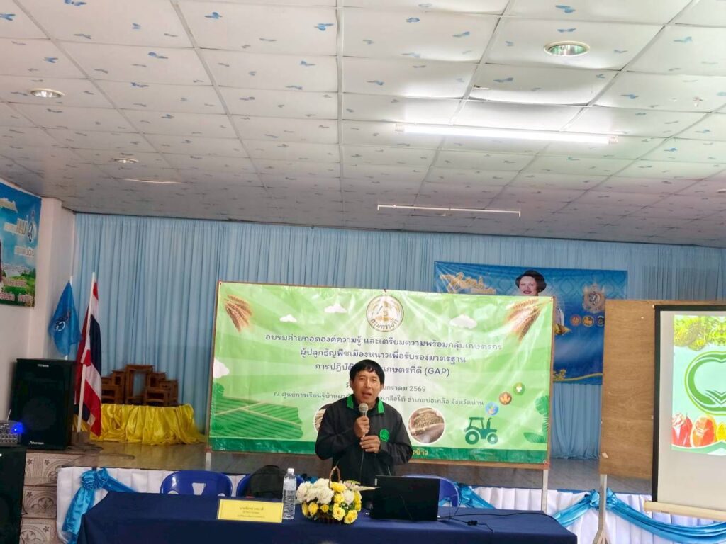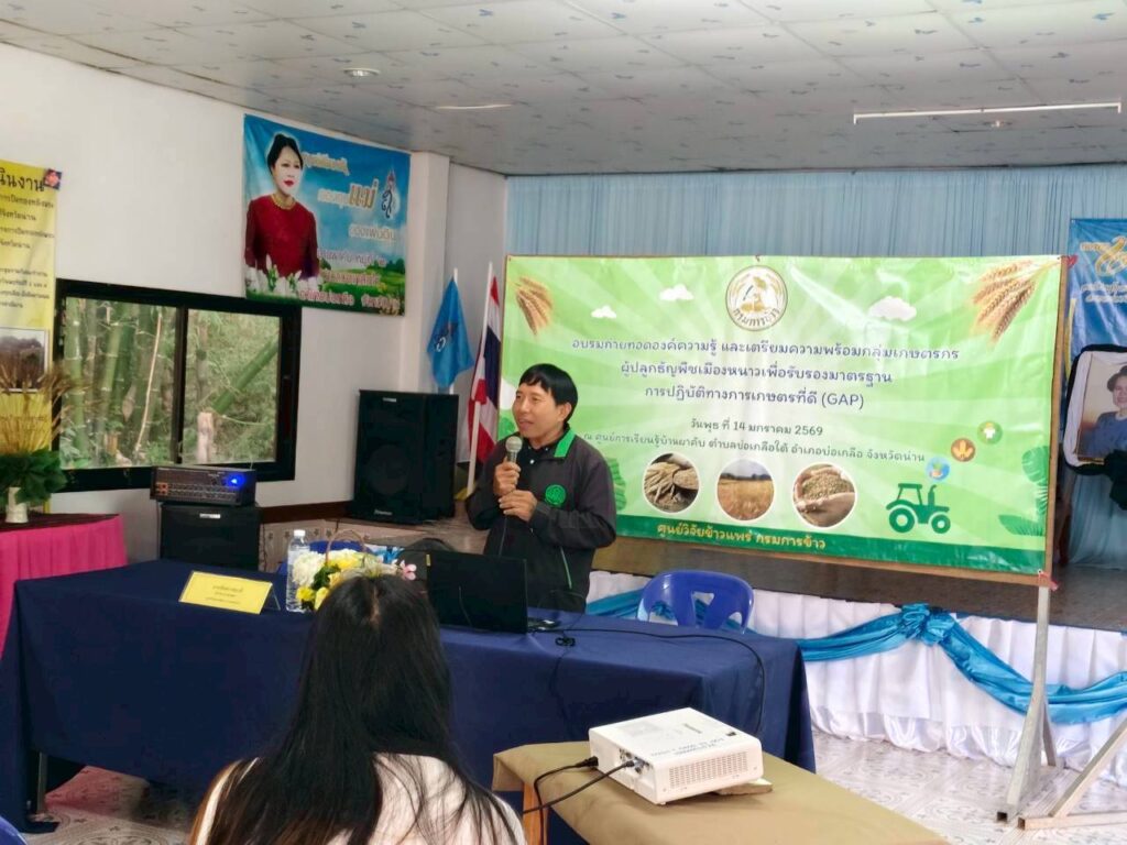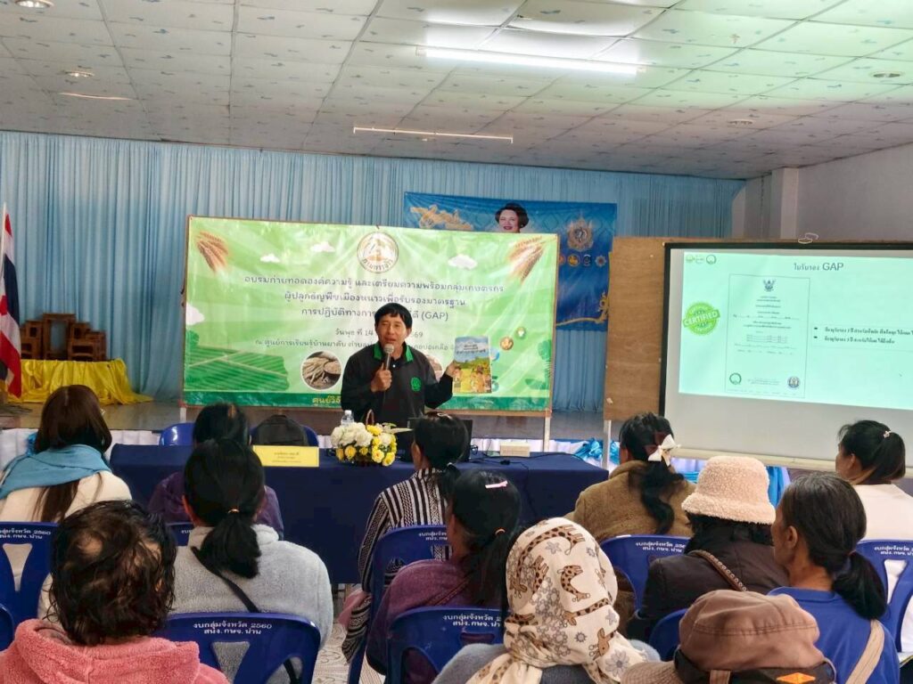 วันที่ 14 มกราคม พ.ศ. 2568 งานตรวจรับรองแหล่งผลิตพืช GAP และพืชอินทรีย์ กลุ่มบริการวิชาการ ศูนย์วิจัยและพัฒนาการเกษตรน่าน ร่วมเป็นวิทยากรถ่ายทอดความรู้ เรื่อง การขอรับรองมาตรฐานการปฏิบัติทางการเกษตรที่ดี GAP เพื่อเตรียมความพร้อมให้แก่กลุ่มเกษตรกรผู้ปลูกธัญพืชเมืองหนาวในการขอรับรองมาตรฐานการปฏิบัติทางการเกษตรที่ดี GAP จำนวน 20 ราย ณ ศูนย์การเรียนรู้บ้านผาคับ ตำบลบ่อเกลือใต้ อำเภอบ่อเกลือ จังหวัดน่าน