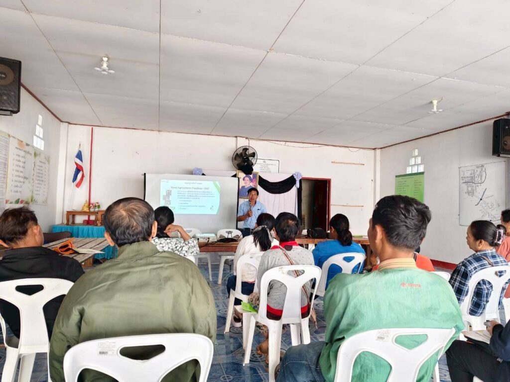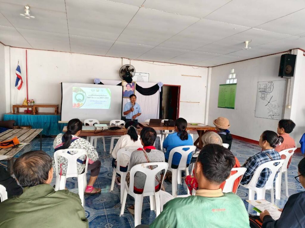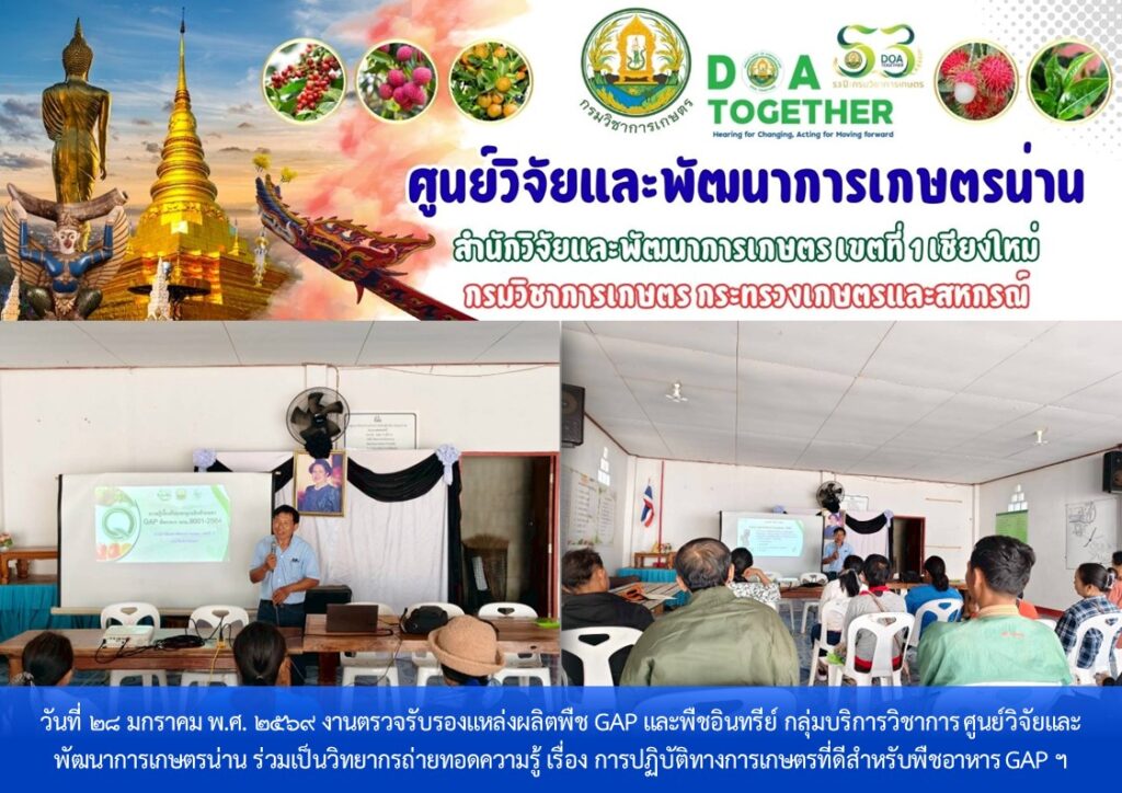 วันที่ 28 มกราคม พ.ศ. 2569 งานตรวจรับรองแหล่งผลิตพืช GAP และพืชอินทรีย์ กลุ่มบริการวิชาการ ศูนย์วิจัยและพัฒนาการเกษตรน่าน ร่วมเป็นวิทยากรถ่ายทอดความรู้ เรื่อง การปฏิบัติทางการเกษตรที่ดีสำหรับพืชอาหาร GAP ตามโครงการระบบส่งเสริมเกษตรแบบแปลงใหญ่เพื่อปรับเพิ่มผลิตภาพการผลิต ประจำปีงบประมาณ 2569 ให้แก่เกษตรกร จำนวน 20 ราย ณ แปลงใหญ่มะขาม หมู่ที่ 2, 3, และ 4 ตำบลบ้านพี้ อำเภอบ้านหลวง จังหวัดน่าน