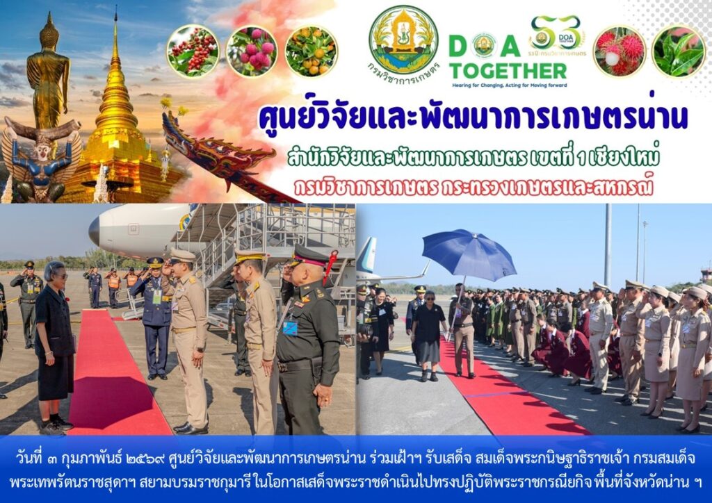 วันที่ 3 กุมภาพันธ์ 2569 ศูนย์วิจัยและพัฒนาการเกษตรน่าน ร่วมเฝ้าฯ รับเสด็จ สมเด็จพระกนิษฐาธิราชเจ้า กรมสมเด็จพระเทพรัตนราชสุดาฯ สยามบรมราชกุมารี ในโอกาสเสด็จพระราชดำเนินไปทรงปฏิบัติพระราชกรณียกิจ พื้นที่จังหวัดน่าน ทรงนำผู้ได้รับพระราชทานรางวัลสมเด็จเจ้าฟ้ามหิดล และคณะกรรมการรางวัลนานาชาติมูลนิธิรางวัลสมเด็จเจ้าฟ้ามหิดล ในพระบรมราชูปถัมภ์ ไปทัศนศึกษา ณ จังหวัดน่าน วันที่ 3 - 5 กุมภาพันธ์ 2569 (เป็นการส่วนพระองค์) โดยมีนายชัยนรงค์ วงศ์ใหญ่ ผู้ว่าราชการจังหวัดน่าน พร้อมด้วยหน่วยงานภาครัฐ เอกชน และพสกนิกรชาวจังหวัดน่าน เฝ้าฯ รับเสด็จ ณ สนามบินน่านนคร ตำบลผาสิงห์ อำเภอเมืองน่าน จังหวัดน่าน