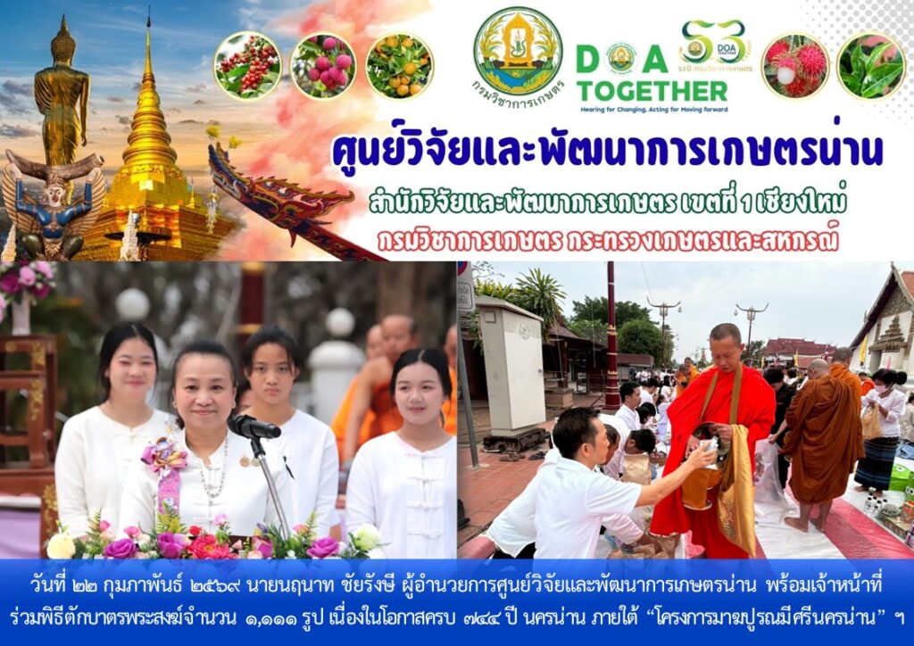 วันที่ 22 กุมภาพันธ์ 2569 นายนฤนาท ชัยรังษี ผู้อำนวยการศูนย์วิจัยและพัฒนาการเกษตรน่าน พร้อมเจ้าหน้าที่ ร่วมพิธีตักบาตรพระสงฆ์จำนวน 1,111 รูป เนื่องในโอกาสครบ 744 ปี นครน่าน ภายใต้ “โครงการมาฆปูรณมีศรีนครน่าน” ทำบุญสืบชะตาเมือง สืบสานฮีตฮอยประเพณีวิถีคนน่าน ซึ่งเป็นอัตตลักษณ์เฉพาะถิ่น นอกจากนี้ยังได้น้อมถวายเป็นพระราชกุศลแด่สมเด็จพระนางเจ้าสิริกิติ์ พระบรมราชินีนาถ พระบรมราชชนนีพันปีหลวง ตลอดจนมีส่วนสร้างกุศลช่วยเหลือคณะสงฆ์ผู้ประสบภัยในจังหวัดน่านและคณะสงฆ์ 323 วัดภาคใต้ โดยมี พระสุนทรมุนี รองเจ้าคณะจังหวัดน่าน เจ้าอาวาสวัดมิ่งเมือง เป็นประธานสงฆ์ นางวิไลวรรณ บุดาสา รองผู้ว่าราชการจังหวัดน่าน เป็นประธานฆราวาส พร้อมด้วยหัวหน้าส่วนราชการ ภาคเอกชน พุทธศาสนิกชนชาวจังหวัดน่านและจังหวัดใกล้เคียงกว่า 3,000 คนเข้าร่วมพิธี ณ บริเวณถนนคนเดิน ข่วงเมืองน่าน ตำบลในเวียง อำเภอเมืองน่าน จังหวัดน่าน