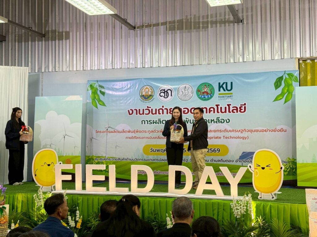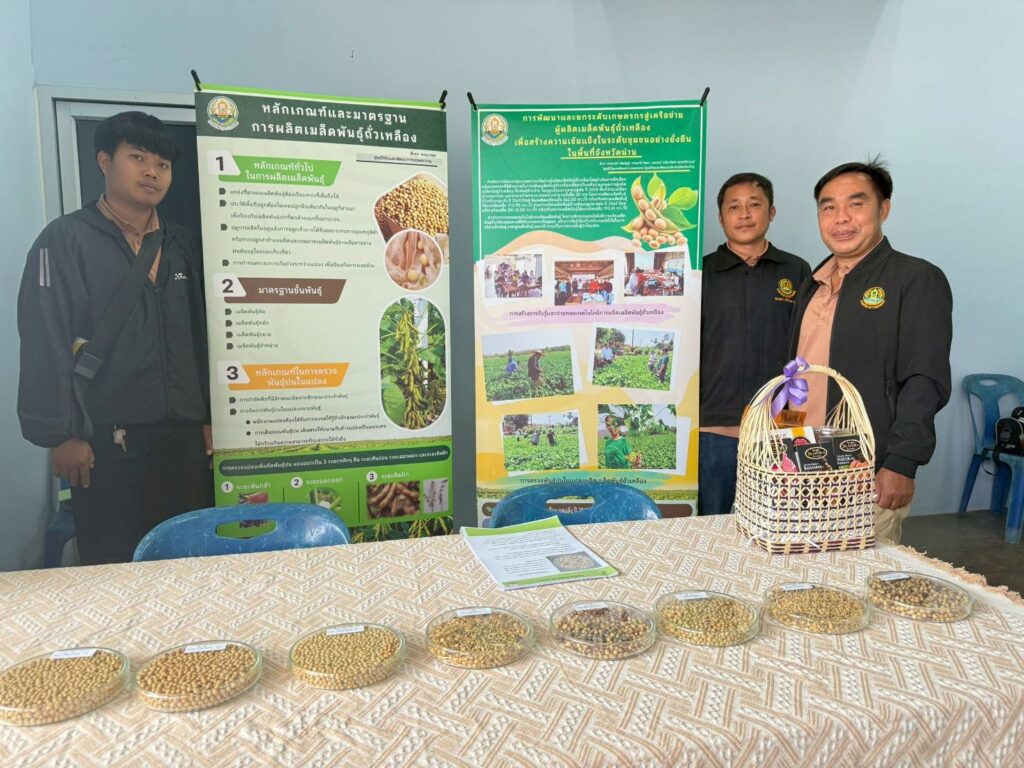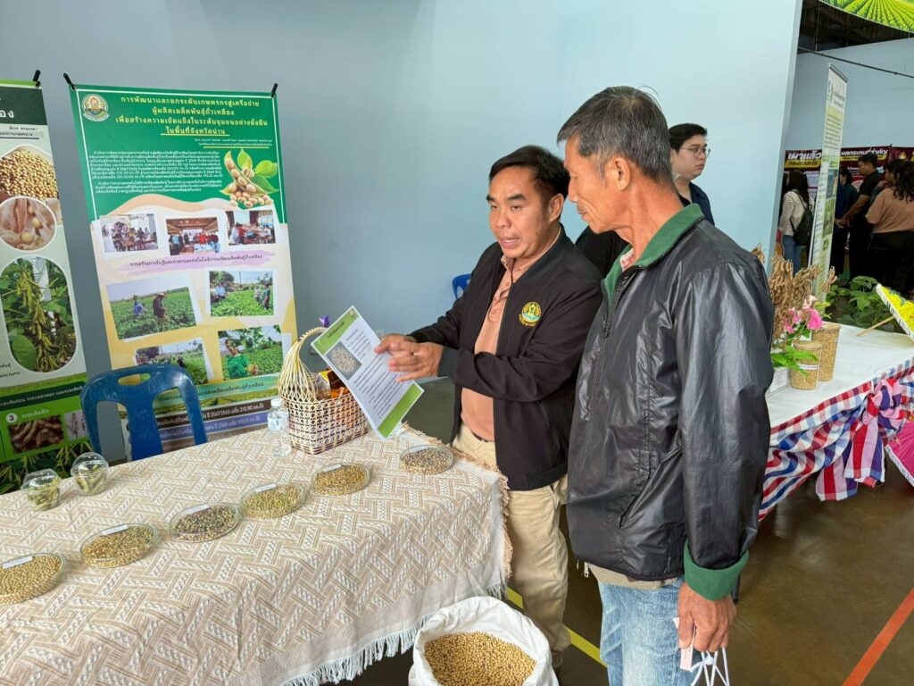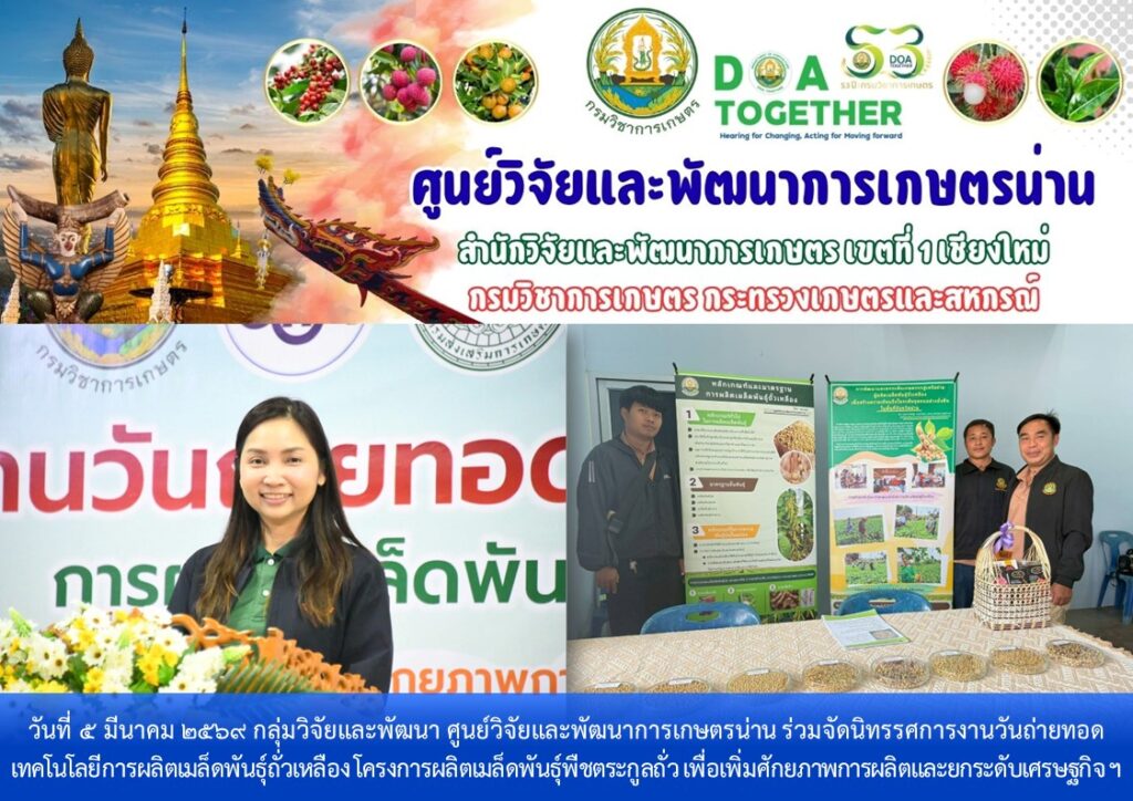 วันที่ 5 มีนาคม 2569 กลุ่มวิจัยและพัฒนา ศูนย์วิจัยและพัฒนาการเกษตรน่าน ร่วมจัดนิทรรศการงานวันถ่ายทอดเทคโนโลยีการผลิตเมล็ดพันธุ์ถั่วเหลือง โครงการผลิตเมล็ดพันธุ์พืชตระกูลถั่ว เพื่อเพิ่มศักยภาพการผลิตและยกระดับเศรษฐกิจชุมชนอย่างยั่งยืน ภายใต้โครงการขับเคลื่อนเทคโนโลยีพร้อมใช้ (Appropriate Technology) เพื่อถ่ายทอดและขยายผลเทคโนโลยีที่เหมาะสมในการผลิตเมล็ดพันธุ์ถั่วเหลืองชั้นพันธุ์จำหน่ายให้แก่เกษตรกรในเขตพื้นที่ภาคเหนือ ให้เกษตรกรนำเทคโนโลยีไปปรับใช้ในการเพิ่มประสิทธิภาพการผลิตทั้งด้านปริมาณและคุณภาพ สามารถส่งต่อเมล็ดพันธุ์คุณภาพดีภายในชุมชนของตนเองและพื้นที่ใกล้เคียงได้มากขึ้น ยกระดับคุณภาพชีวิตของเกษตรกร ส่งผลให้เกิดความมั่นคงและยั่งยืนทางด้านอาหารต่อไป โดยมี นางสาวเชาวนาถ พฤทธิเทพ ผู้เชี่ยวชาญด้านพืชไร่ตระกูลถั่ว ผู้อำนวยการกองวิจัยพัฒนาพืชเศรษฐกิจใหม่และการจัดการก๊าซเรือนกระจกสำหรับภาคเกษตร รักษาการในตำแหน่ง ผู้อำนวยการสำนักผู้เชี่ยวชาญ เป็นประธานในพิธี มีผู้เข้าร่วมกิจกรรมทั้งภาครัฐ ภาคเอกชน และกลุ่มเกษตรกร จำนวน 200 ราย ณ ศูนย์กระจายสินค้าด้านนวัตกรรมเกษตรปลอดภัย ประชารัฐ จังหวัดน่าน ตำบลถืมตอง อำเภอเมืองน่าน จังหวัดน่าน