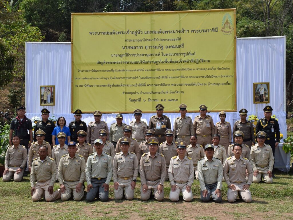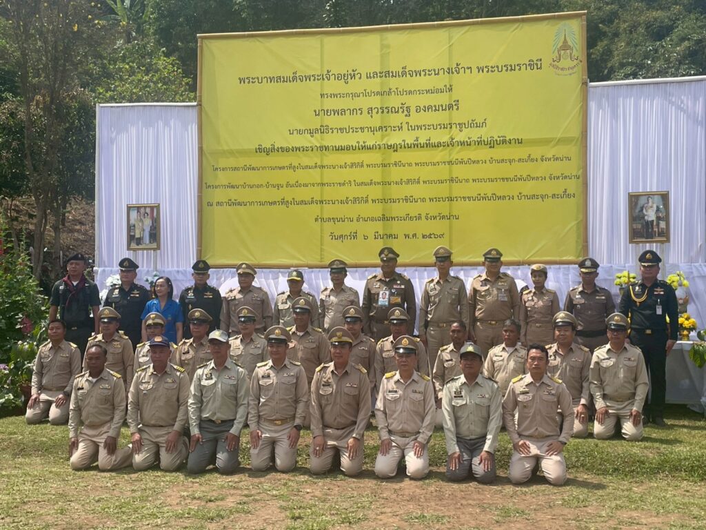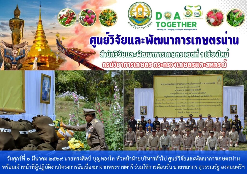 วันศุกร์ที่ 6 มีนาคม 2569 นายทรงศิลป์ บุญทองโท หัวหน้าฝ่ายบริหารทั่วไป ศูนย์วิจัยและพัฒนาการเกษตรน่าน พร้อมเจ้าหน้าที่ผู้ปฏิบัติงานโครงการอันเนื่องมาจากพระราชดำริ ร่วมให้การต้อนรับ นายพลากร สุวรรณรัฐ องคมนตรี ประธานอนุกรรมการติดตามและขับเคลื่อนโครงการอันเนื่องมาจากพระราชดำริในพื้นที่ภาคเหนือ พร้อมคณะ ในการติดตามและขับเคลื่อนโครงการสถานีพัฒนาการเกษตรที่สูงในสมเด็จพระนางเจ้าสิริกิติ์ พระบรมราชินีนาถ พระบรมราชชนนีพันปีหลวง บ้านสะจุก-สะเกี้ยง และเชิญถุงพระราชทานจากพระบาทสมเด็จพระเจ้าอยู่หัว และสมเด็จพระนางเจ้า ฯ พระบรมราชินี จำนวน 476 ถุง ไปมอบแก่ราษฎรและเจ้าหน้าที่ผู้ปฏิบัติงานในพื้นที่ โครงการสถานีพัฒนาฯ บ้านสะจุก-สะเกี้ยง จำนวน 325 ถุง และโครงการพัฒนาบ้านกอก-บ้านจูนอันเนื่องมาจากพระราชดำริ จำนวน 151 ถุง และเยี่ยมชมแปลงการเกษตรในพื้นที่โครงการและร่วมทำกิจกรรมต่าง ๆ ด้านการเกษตร โดยมี ว่าที่ร้อยตรี ณฐพล นพณัฐธนากุล นายอำเภอเฉลิมพระเกียรติ กล่าวต้อนรับ ณ โครงการสถานีพัฒนาการเกษตรที่สูงฯ บ้านสะจุก-สะเกี้ยง ตำบลขุนน่าน อำเภอเฉลิมพระเกียรติ จังหวัดน่าน