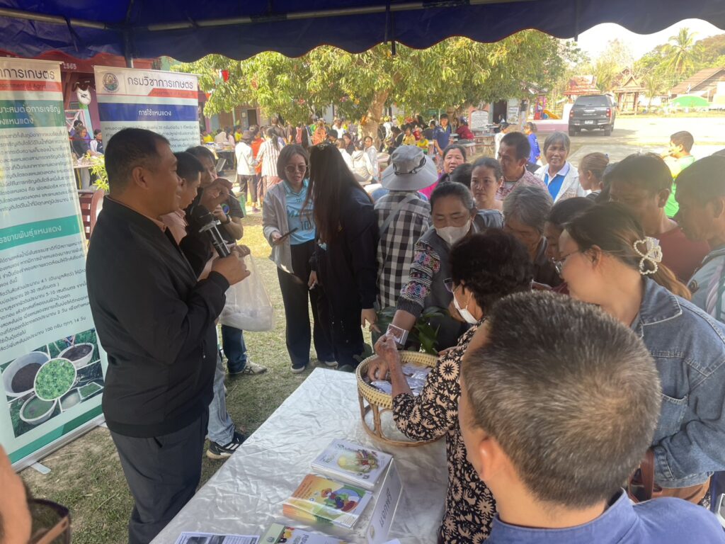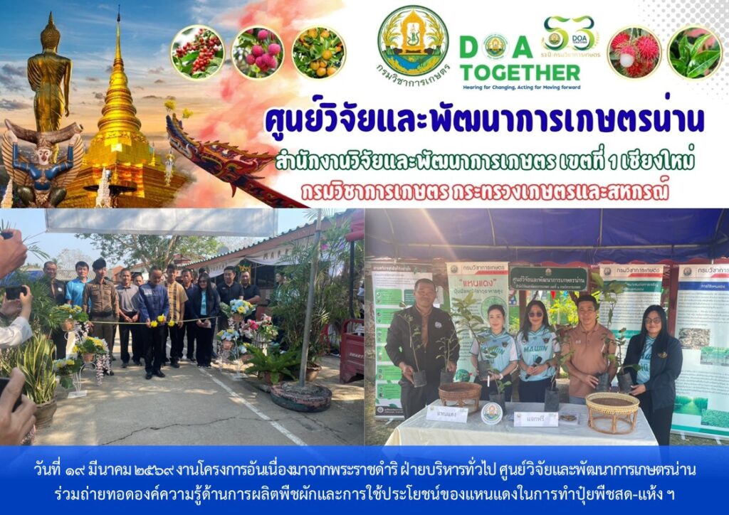 วันที่ 19 มีนาคม 2569 งานโครงการอันเนื่องมาจากพระราชดำริ ฝ่ายบริหารทั่วไป ศูนย์วิจัยและพัฒนาการเกษตรน่าน ร่วมถ่ายทอดองค์ความรู้ด้านการผลิตพืชผักและการใช้ประโยชน์ของแหนแดงในการทำปุ๋ยพืชสด-แห้ง แก่ นักเรียนและคณะครูโรงเรียนบ้านเป้า เกษตรกร และประชาชนชาวอำเภอบ้านหลวง ภายใต้กิจกรรม “กาดละอ่อน ประจำปีการศึกษา 2568” โดยวัตถุประสงค์ของกิจกรรมเพื่อให้ผู้เรียนนำผลิตภัณฑ์พื้นถิ่นมาจำหน่าย เช่น พืชผัก ผลไม้ วัสดุในท้องถิ่น เป็นการสร้างรายได้ และเกิดความภาคภูมิใจรวมถึงการเห็นความสำคัญของท้องถิ่นตนเอง โดยมี นายอธิวัฒน์ อารัญ นายอำเภอบ้านหลวง เป็นประธานเปิดกิจกรรม ณ โรงเรียนบ้านเป้า ตำบลบ้านฟ้า อำเภอบ้านหลวง จังหวัดน่าน