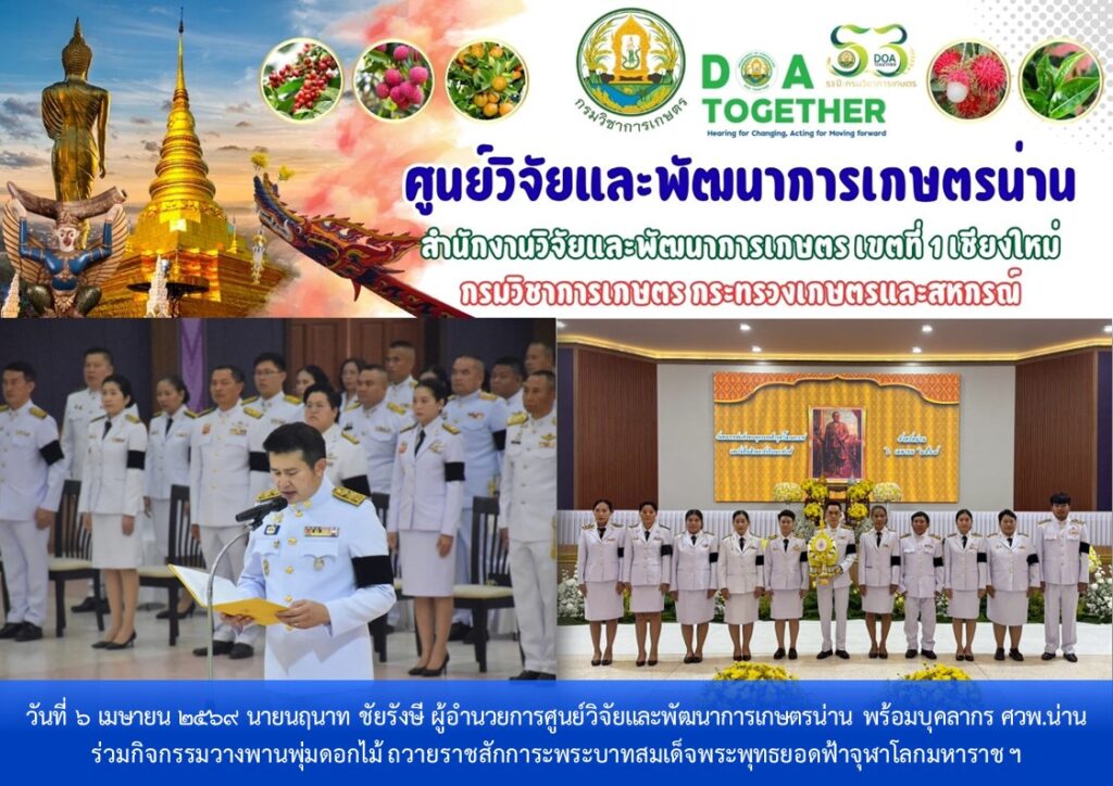วันที่ 6 เมษายน 2569 นายนฤนาท ชัยรังษี ผู้อำนวยการศูนย์วิจัยและพัฒนาการเกษตรน่าน พร้อมบุคลากร ศวพ.น่าน ร่วมกิจกรรมวางพานพุ่มดอกไม้ ถวายราชสักการะพระบาทสมเด็จพระพุทธยอดฟ้าจุฬาโลกมหาราช เนื่องในวัน “พระบาทสมเด็จพระพุทธยอดฟ้าจุฬาโลกมหาราช” และ วันที่ระลึกมหาจักรีบรมราชวงศ์ โดยมี นายชัยนรงค์ วงศ์ใหญ่ ผู้ว่าราชการจังหวัดน่าน เป็นประธานในพิธี พร้อมด้วยรองผู้ว่าราชการจังหวัดน่าน หัวหน้าส่วนราชการ ศาล ทหาร ตำรวจ ข้าราชการ ภาคเอกชน และประชาชนชาวน่านเข้าร่วมพิธีอย่างพร้อมเพรียงกัน ณ หอประชุมนันทพัฒน์ ศูนย์ราชการจังหวัดน่าน อำเภอเมืองน่าน จังหวัดน่าน