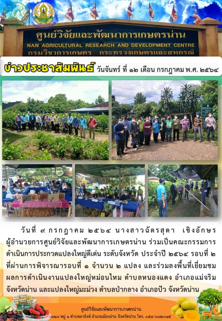 กลุ่มบริหารงานทั่วไปข่าวประชาสัมพันธ์ นางสาวฉัตรสุดา เชิงอักษร ผู้อำนวยการศูนย์วิจัยและพัฒนาการเกษตรน่าน ร่วมเป็นคณะกรรมการ ดำเนินการประกวดแปลงใหญ่ดีเด่น ระดับจังหวัด ประจำปี 2564 รอบที่ 2 ที่ผ่านการพิจารณารอบที่ 1 จำนวน 2 แปลง 12 กรกฎาคม 2564 adminnan