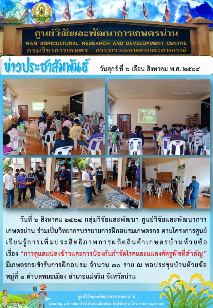 กลุ่มวิจัยและพัฒนาข่าวประชาสัมพันธ์ กลุ่มวิจัยและพัฒนา ศูนย์วิจัยและพัฒนาการเกษตรน่าน ร่วมเป็นวิทยากรบรรยายการฝึกอบรมเกษตรกร ตามโครงการศูนย์เรียนรู้การเพิ่มประสิทธิภาพการผลิตสินค้าเกษตรบ้านห้วยซ้อ เรื่อง “การดูแลแปลงข้าวและการป้องกันกำจัดโรคและแมลงศัตรูพืชที่สำคัญ” มีเกษตรกรเข้ารับการฝึกอบรม จำนวน 30 ราย 6 สิงหาคม 2564 adminnan