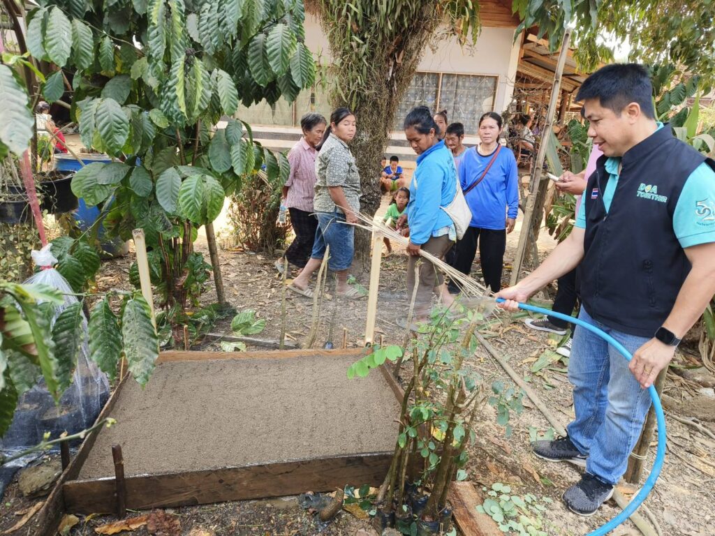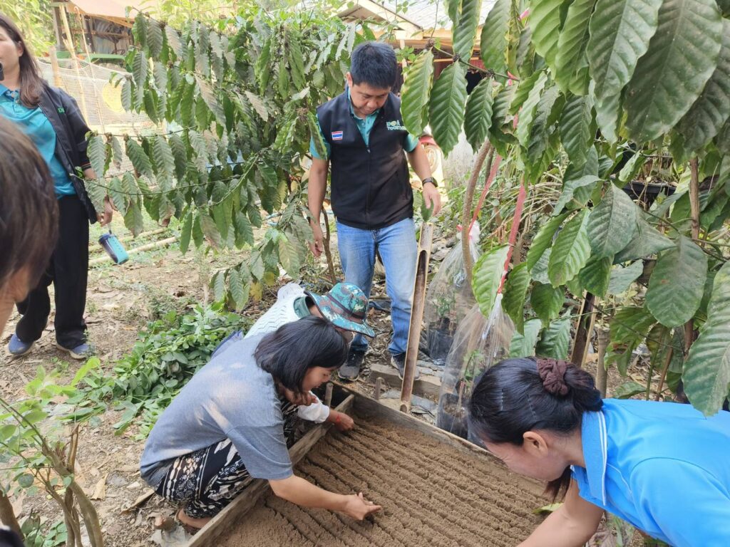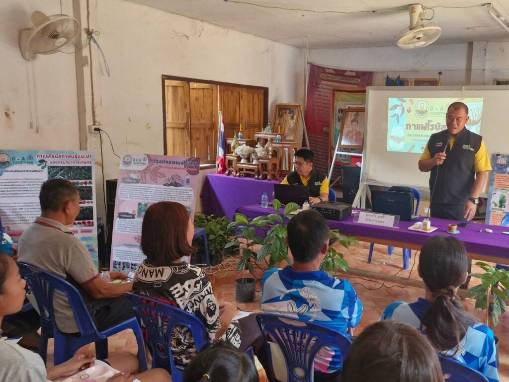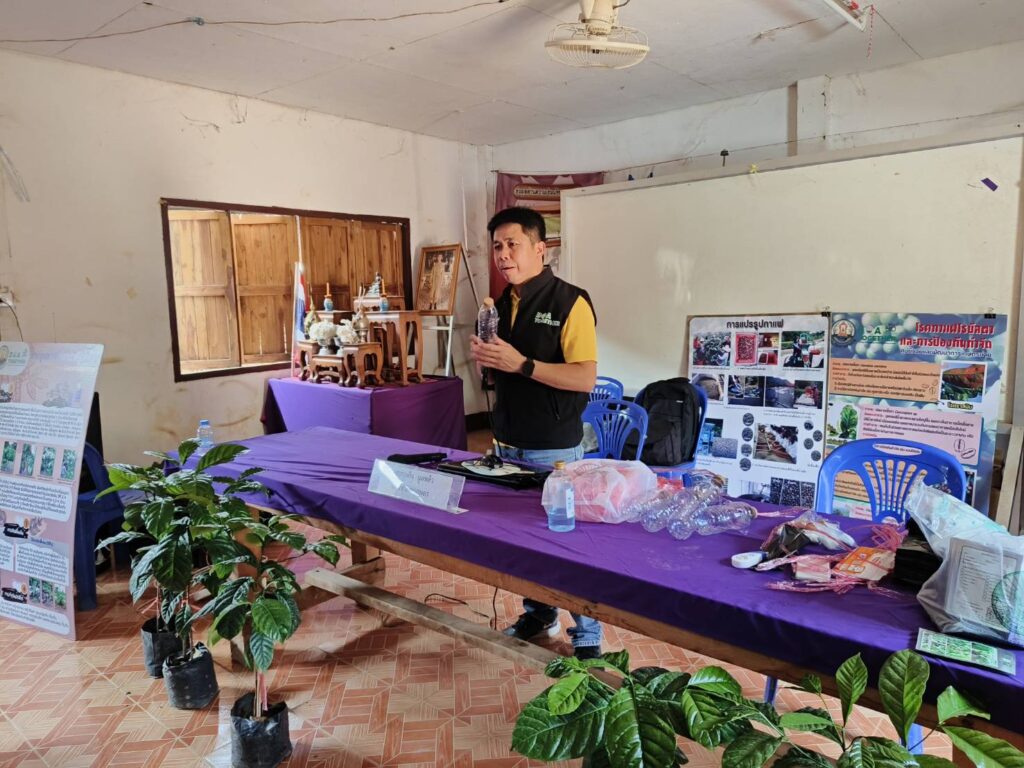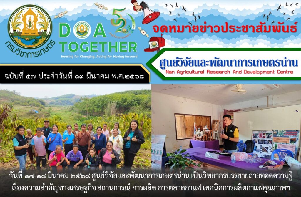 วันที่ 17-18 มีนาคม 2568 ศูนย์วิจัยและพัฒนาการเกษตรน่าน เป็นวิทยากรบรรยายถ่ายทอดความรู้ เรื่องความสำคัญทางเศรษฐกิจ สถานการณ์ การผลิต การตลาดกาแฟ เทคนิคการผลิตกาแฟคุณภาพ การปลูกและการดูแลรักษา การขยายพันธุ์ การเก็บเกี่ยว และการปฏิบัติหลังการเก็บเกี่ยว โครงการเกษตรปลอดภัยและมูลค่าสูง กิจกรรมการเพิ่มประสิทธิภาพการผลิตกาแฟน่าน เชื่อมโยง BCG Model เพื่อเสริมสร้างศักยภาพของเกษตรกรในการผลิตกาแฟพันธุ์ดี มีคุณภาพสอดคล้องกับความต้องการของตลอด ส่งเสริมการนำวัสดุเหลือใช้มาทำให้เกิดประโยขน์ และลดต้นทุนการผลิต ให้กับเกษตรกรผู้ปลูกกาแฟ จำนวน 30 ราย ณ หอประชุมประจำหมู่บ้าน บ้านห้วยเลา หมู่ที่ 1 ตำบลชนแดน อำเภอสองแคว จังหวัดน่าน