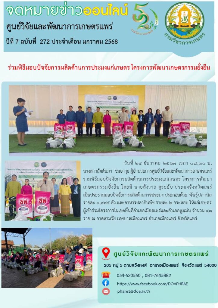 ร่วมพิธีมอบปัจจัยการผลิตด้านการประมงแก่เกษตร โครงการพัฒนาเกษตรกรรมยั่งยืน 27 ธันวาคม 2025 pharedoa ข่าวกิจกรรม จำนวนคนดู 2 FacebookFacebookXXLINELine